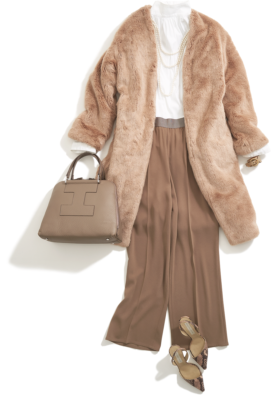 「定番のブラックやネイビー以外を選びたい時には、シックな色の中でも馴染むベージュがおすすめ。落ち感のある生地が美しく揺れるパンツを中心に、同系色で合わせたバッグの遊びのあるデザインがスタイルの決め手に。ベージュコーデは全体が少しぼやけるので、バッグのロゴデザインやパイソン柄のシューズ、毛足の長いコートなどのアイテムでメリハリを」