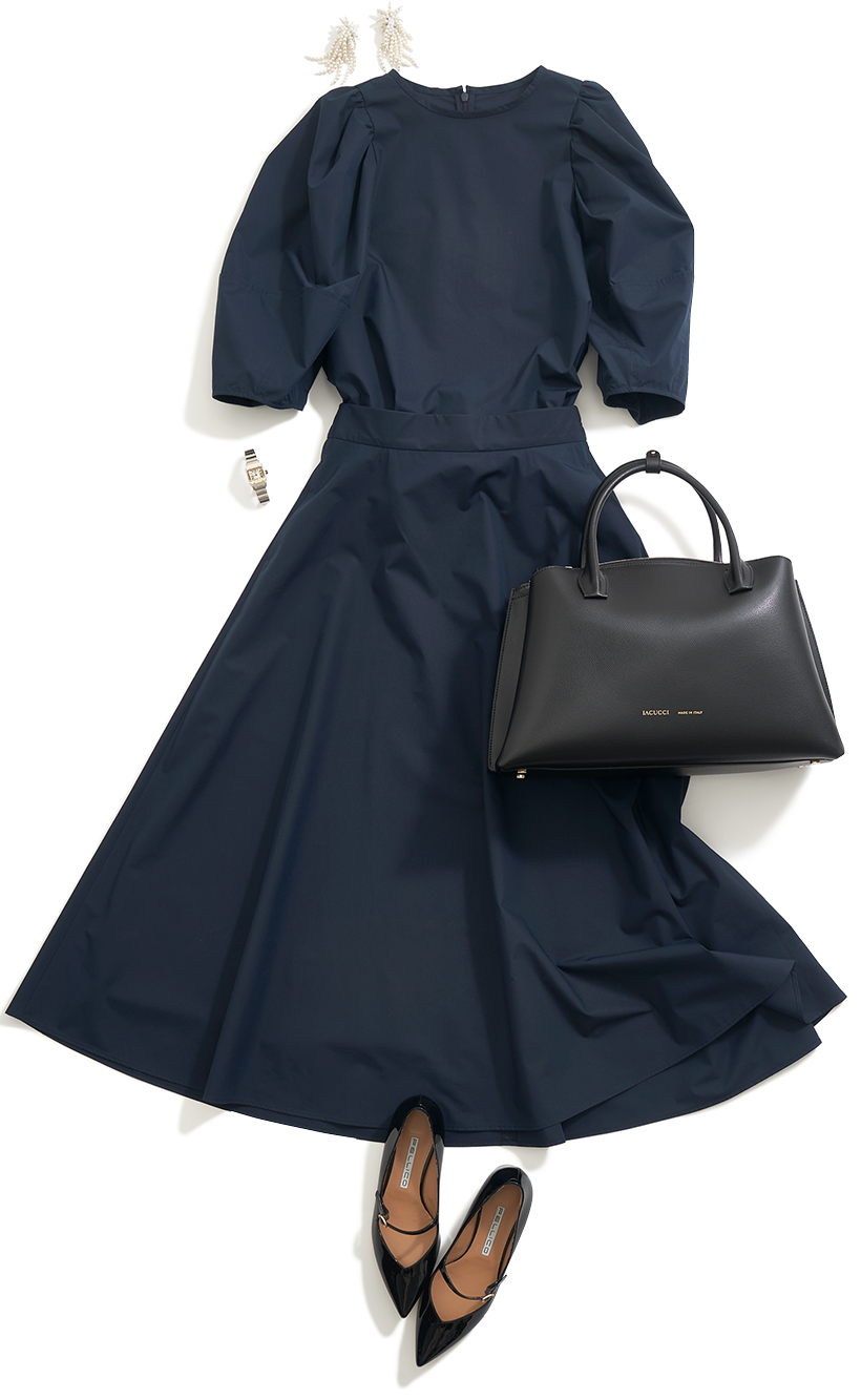 「ボリューム×ボリュームのシルエットは今年らしいバランス。スカートや袖を印象的に、アクセサリーは顔まわりのみ、靴とバッグもシンプルに合わせてセットアップを仕上げました。また、式典とはいえ学校からの配布物も多いので、バッグは少し大きめのこのサイズ感が便利。艶感と曲線的なラインに女っぽさがあるのでカジュアルさが軽減され、大きいサイズでもバランスよく持つことができます」