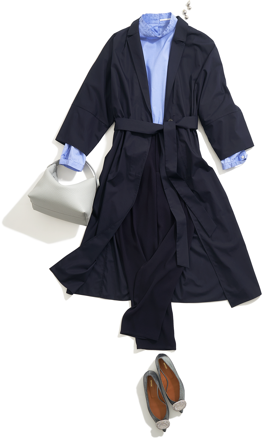 「前向きな気持ちになるサックスブルーと明るいトーンのバッグで、ネイビーコーデに入学式の晴々しいイメージをプラス。ロングカーデ感覚で着られるコートは、ベルトを締めてXラインをつくるとスタイルアップにも。ワントーンカラーとワンハンドルが新鮮さを与えてくれるバッグは、クタっと柔らかなフォルムと小ぶりなデザインが今時な空気を演出してくれます」