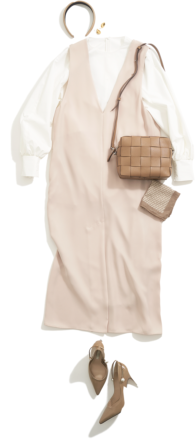 「ワンショルダーだとかっちりした印象、斜めがけだとカジュアルな印象になるのでインナーに合わせてバッグの持ち方を変えてみては。ワンピースはフォーマルな素材なのでカジュアルなものとのミックスが◎。ブーツやタートル、スウェットパンツをはいてスニーカーと合わせたり、上からニットを着てタイトスカートのように見せるのもかわいいです」