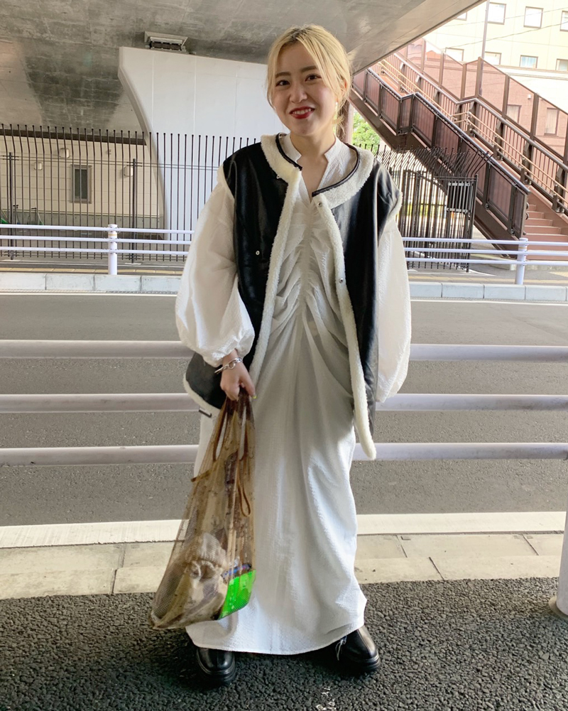 ハードな印象のレザーを、甘めなワンピースと合わせて甘辛ミックスのスタイリングにしました!色合いがシンプルなので、バッグをポイントに個性を出したところもポイントです!