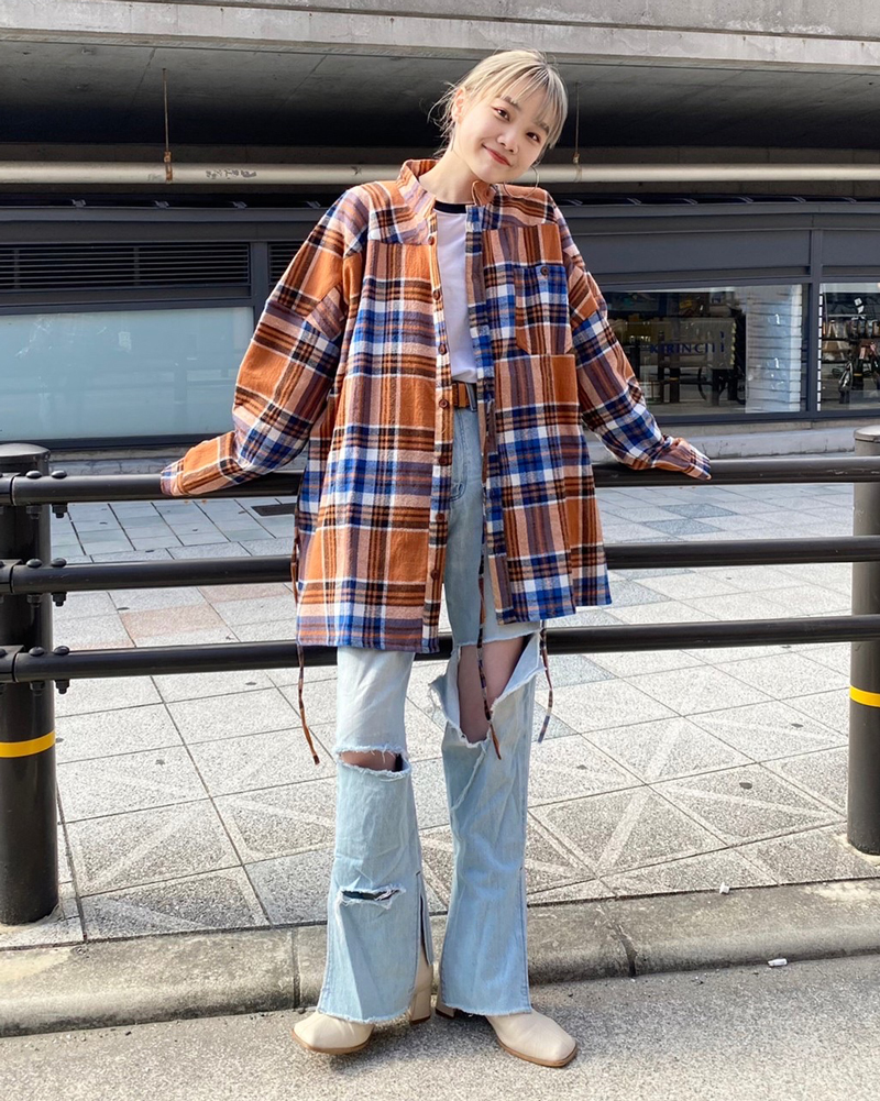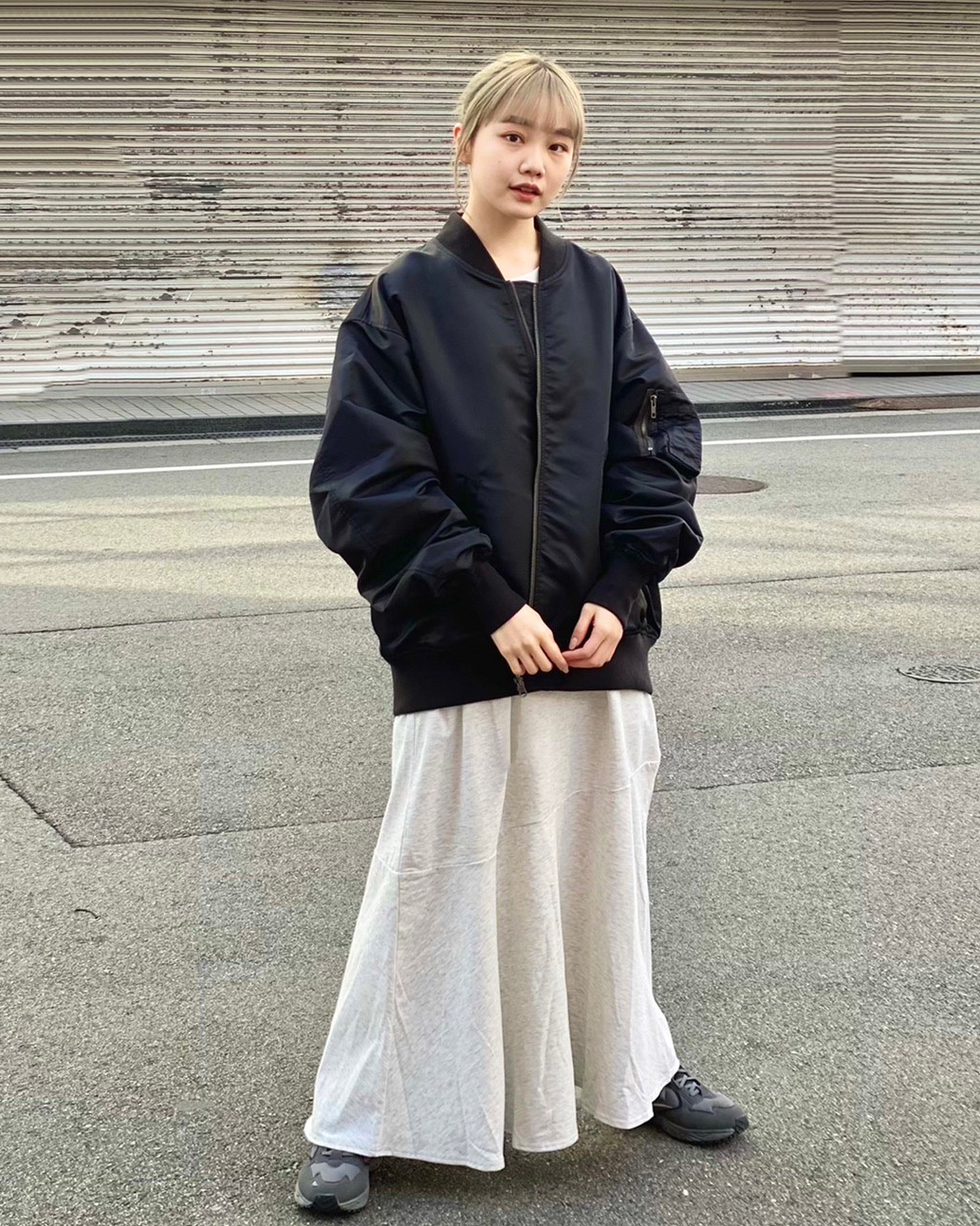 ごつっとしたシューズ合わせでメンズライクに見えるようにバランスをとりました。