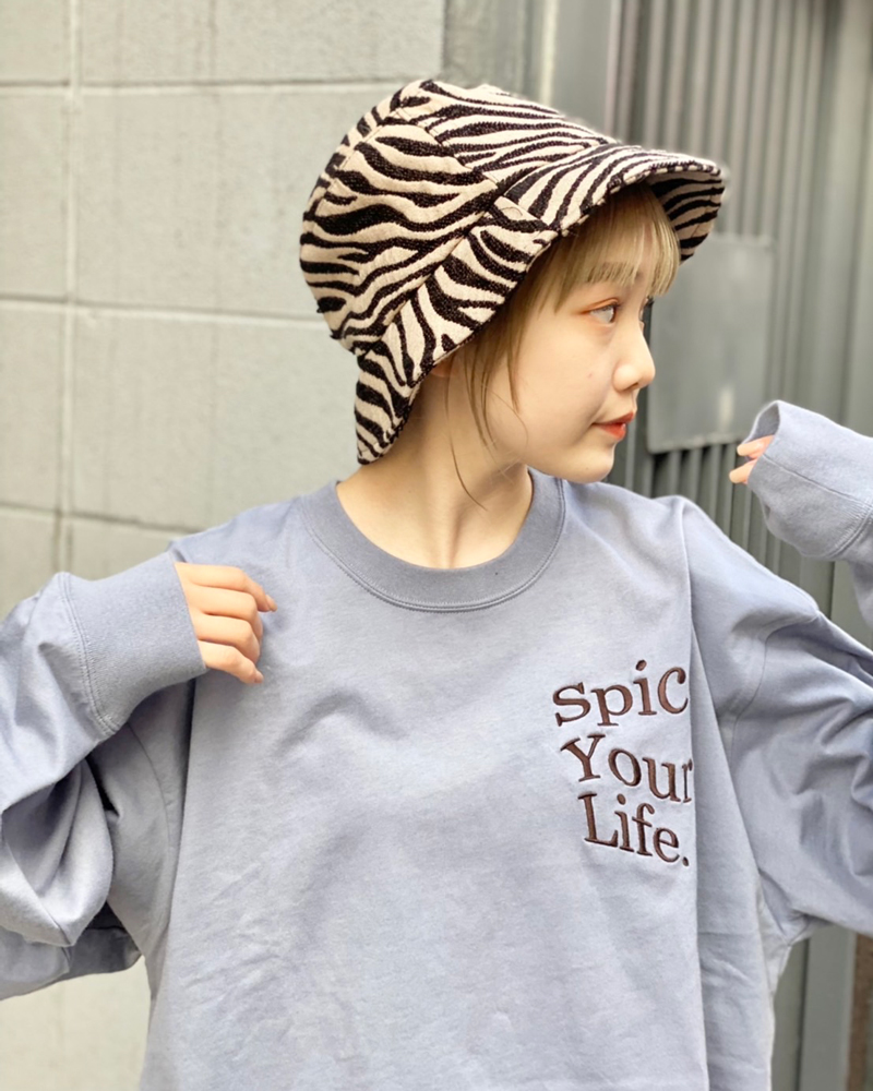 バケットハットがメインになるようにシンプルなロゴのロンTと合わせたのがポイントです。