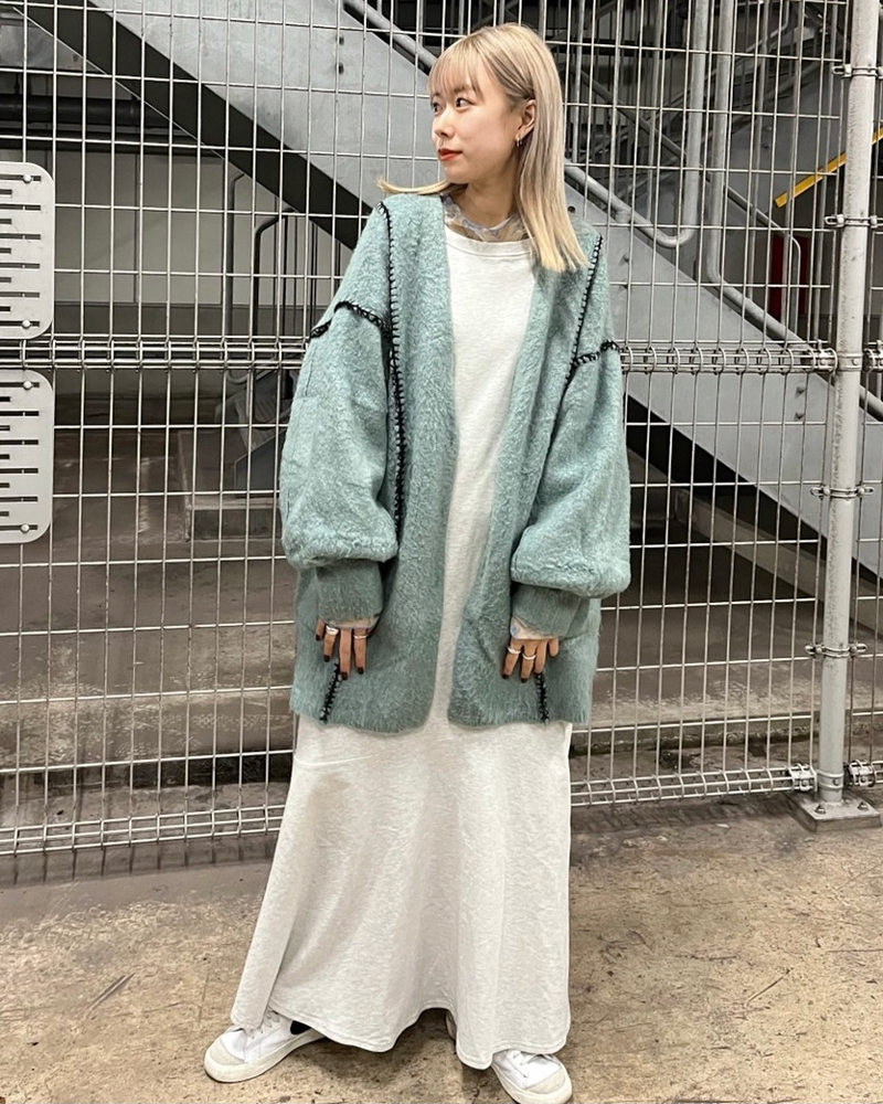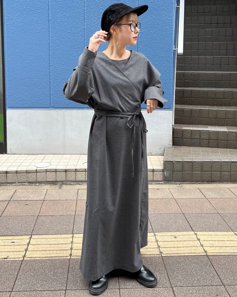 お気に入りのスウェットワンピースに前開きで羽織るスタイリング!最近の気温に丁度良さそうなスタイリングです!シンプルなワンピースもガウンを羽織ることで、ポイントになりますね!!
