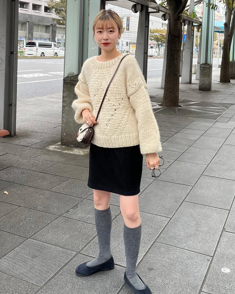 白ニットで王道に可愛いく!ミニスカート×ロングブーツはもちろん、ロングブーツのバランスに飽きたな〜という方には、ハイソックスがおすすめ!足元変えるだけでコーディネートが、がらっと新鮮になりますよ!