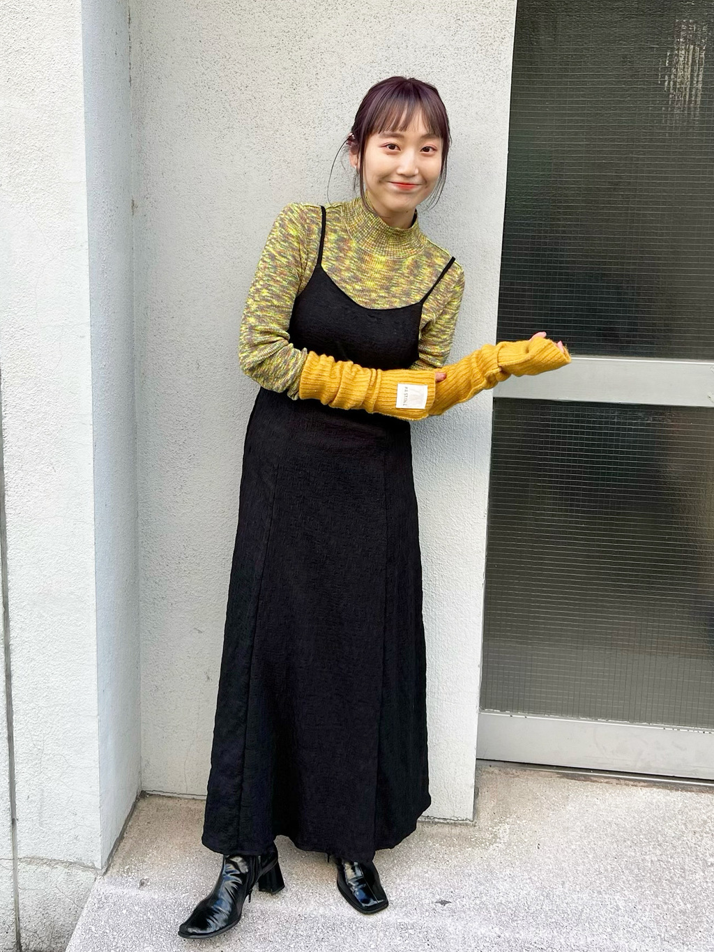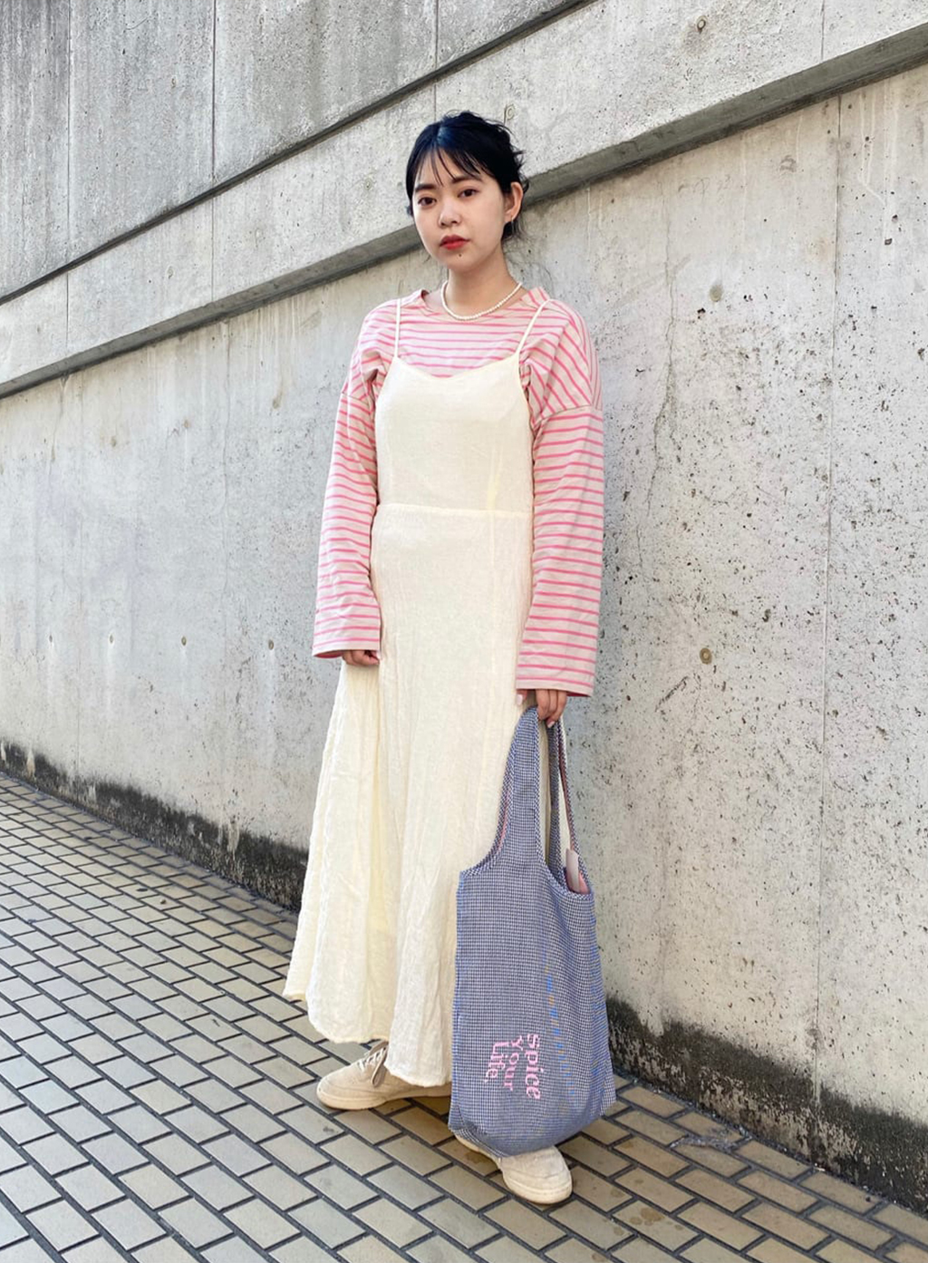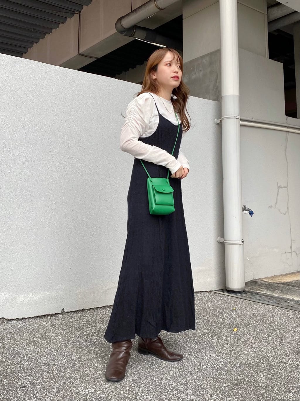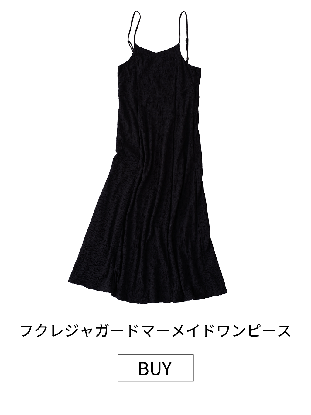 キャミワンピはインナー次第で年中無休。マーメイドのシルエットですがストレッチが効いているので骨盤の広さをきれいにカバーしてくれます。