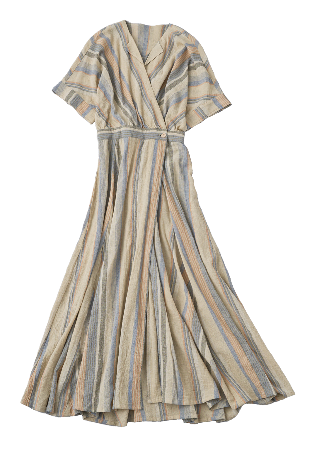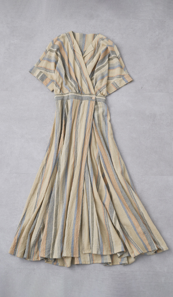 存在感があり1枚で完成しちゃうワンピースですが、小物を変えれば印象もがらりと変わります。前開きにもできるので羽織としても◎