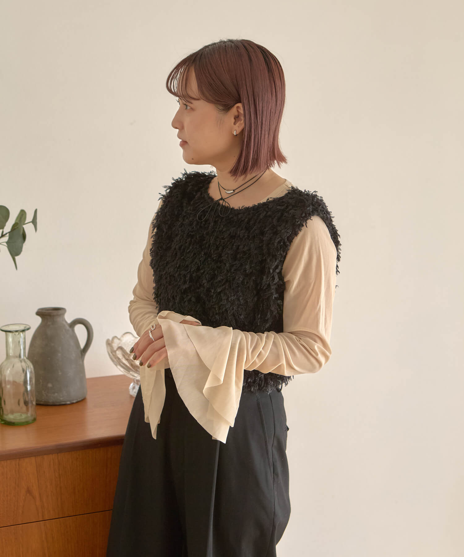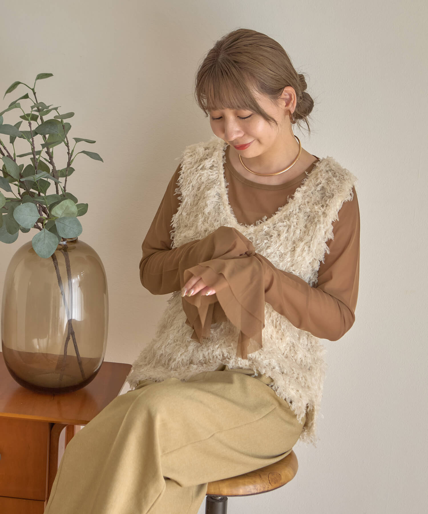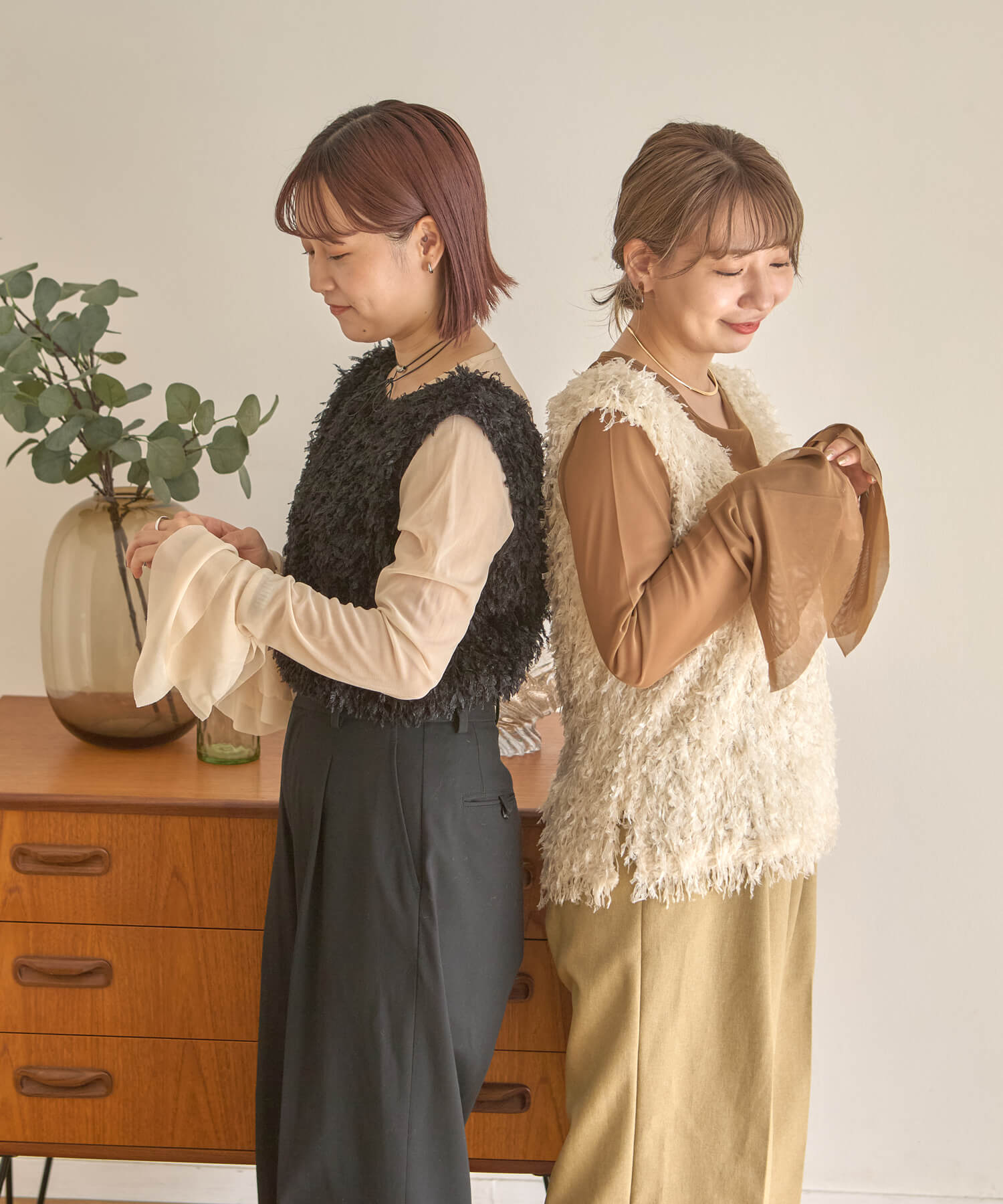 合わせるインナーを変える事でロングシーズン着回しできるフェザーベスト。