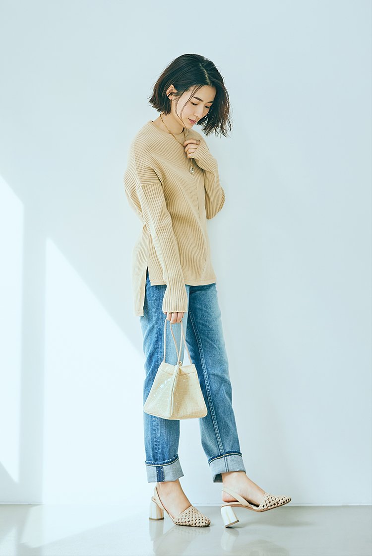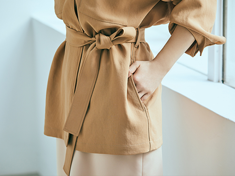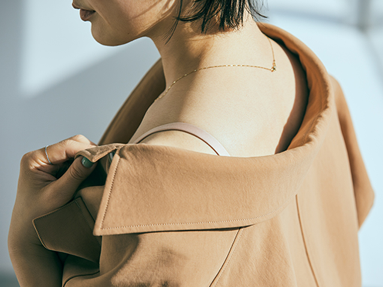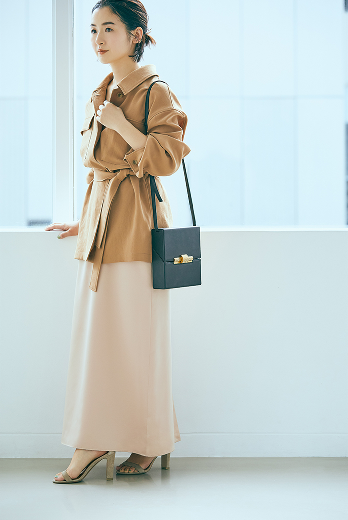 柔らかな風合いのフェイクスエードのコートとブラウス。「個人的にも春夏にスエード調の素材を取り入れるのが好きです。アイボリーやピンクは顔色がきれいに見えつつ、ドライな質感のおかげで、女っぽくなり過ぎないのがいいですね」