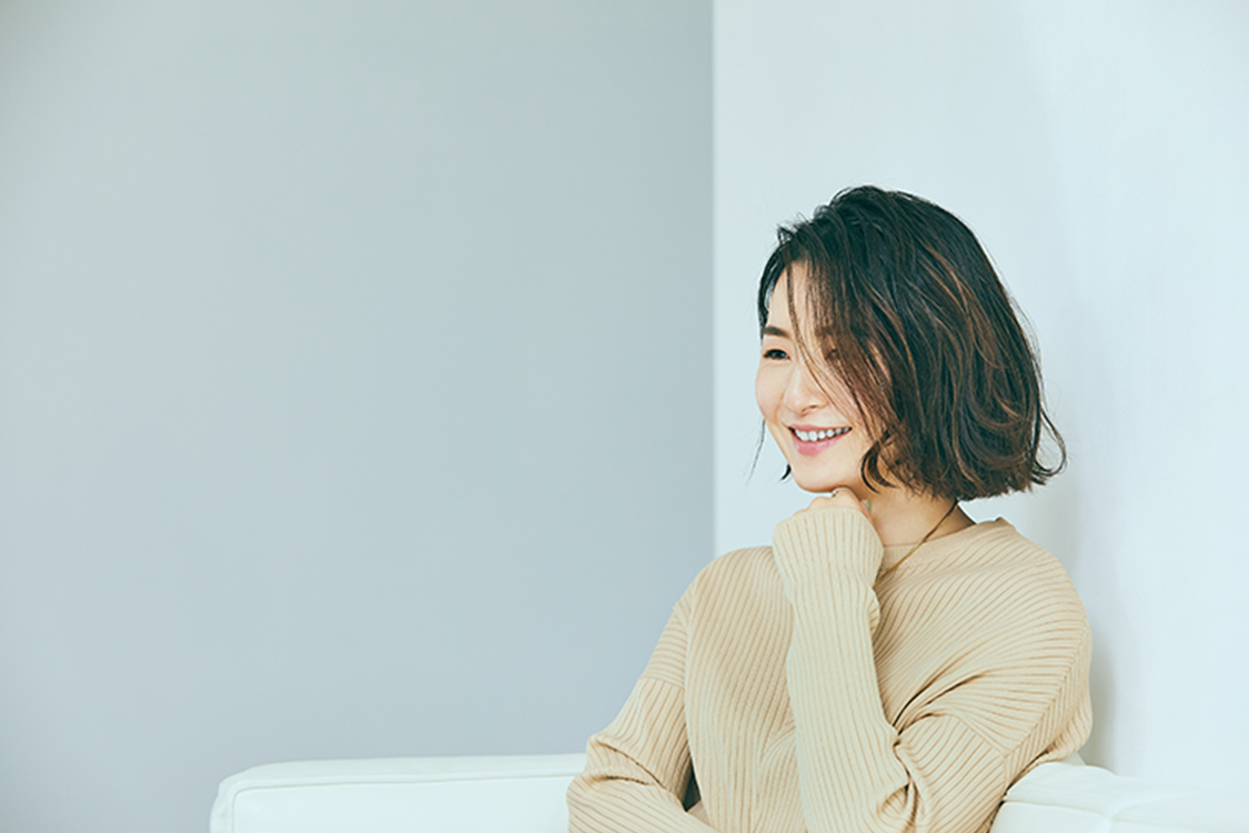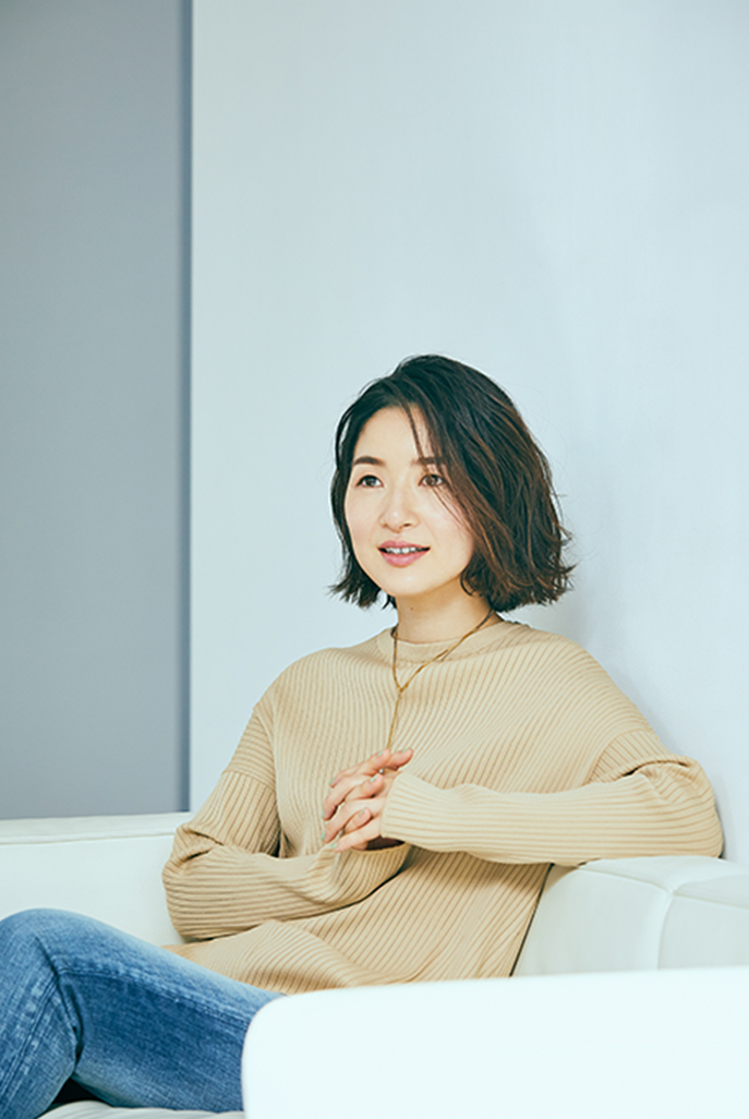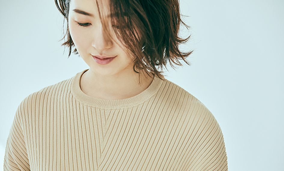 滑らかな肌触りと軽い着心地が魅力のワイドリブニット。バイアス編みは華奢見え効果も。「黄味の強いベージュは春夏のトレンド。リラックス感のあるロング丈も今の気分です。イエローベージュにはブルーデニムを合わせ、春らしいフレッシュなコントラストをつけました。ゆったりとしたドロップショルダーは抜けの出るスリットや前後差があると、小柄な私でもバランスを取りやすく、着やすいです」。