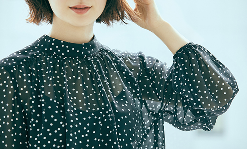 A.仕事をしていると自分本位ではいられないですよね。それはファッションにも言えることで、自分がおしゃれだと思うことよりも、相手がどう思うかが肝心。相手があっての仕事だと思うので、シーンに合ったおしゃれが大事です。着用したドットのブラウスで言えば、ベースが黒だからOK。合わせるボトムはシンプルですっきりとしたラインにするなど、バランスを取ります。
