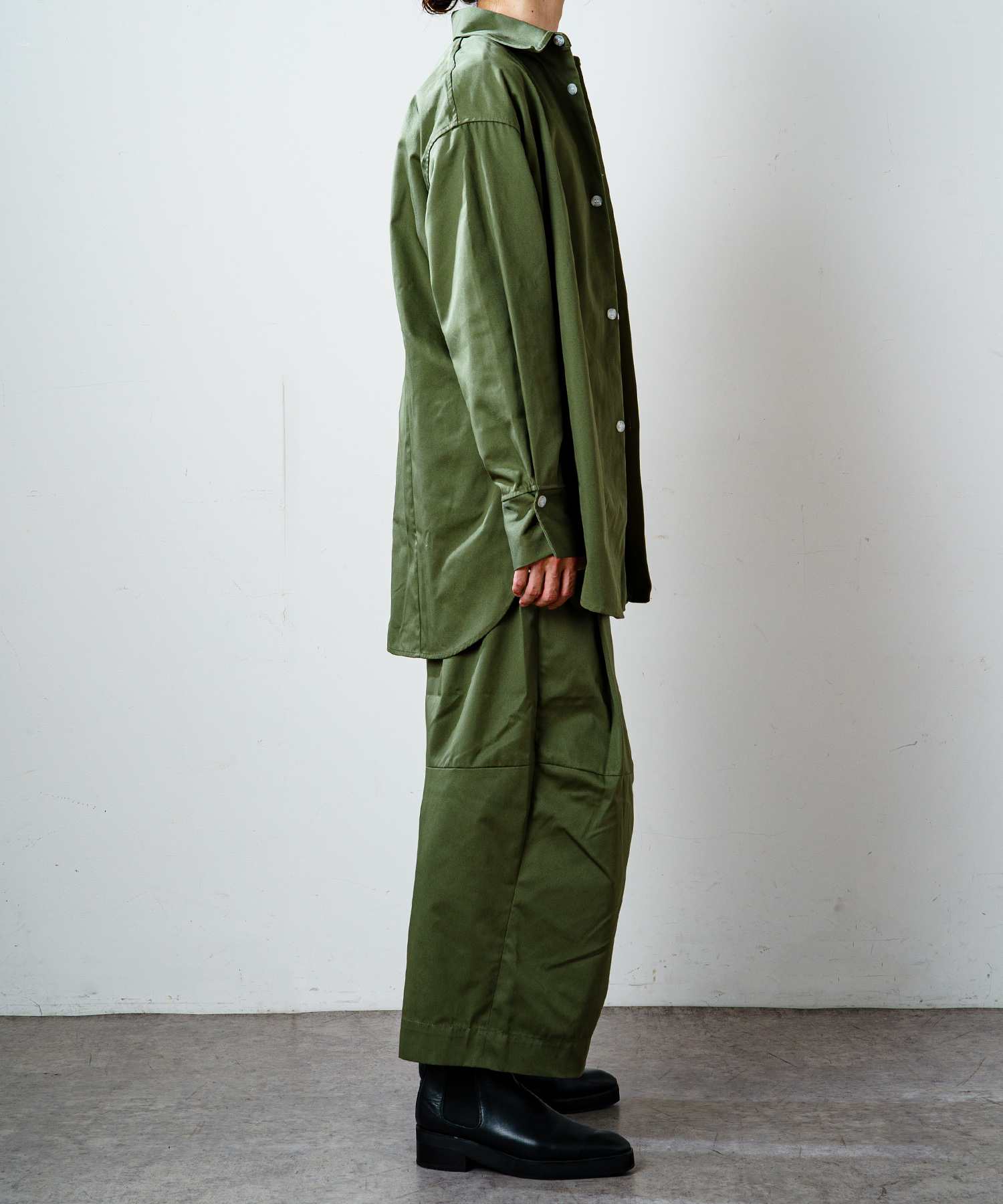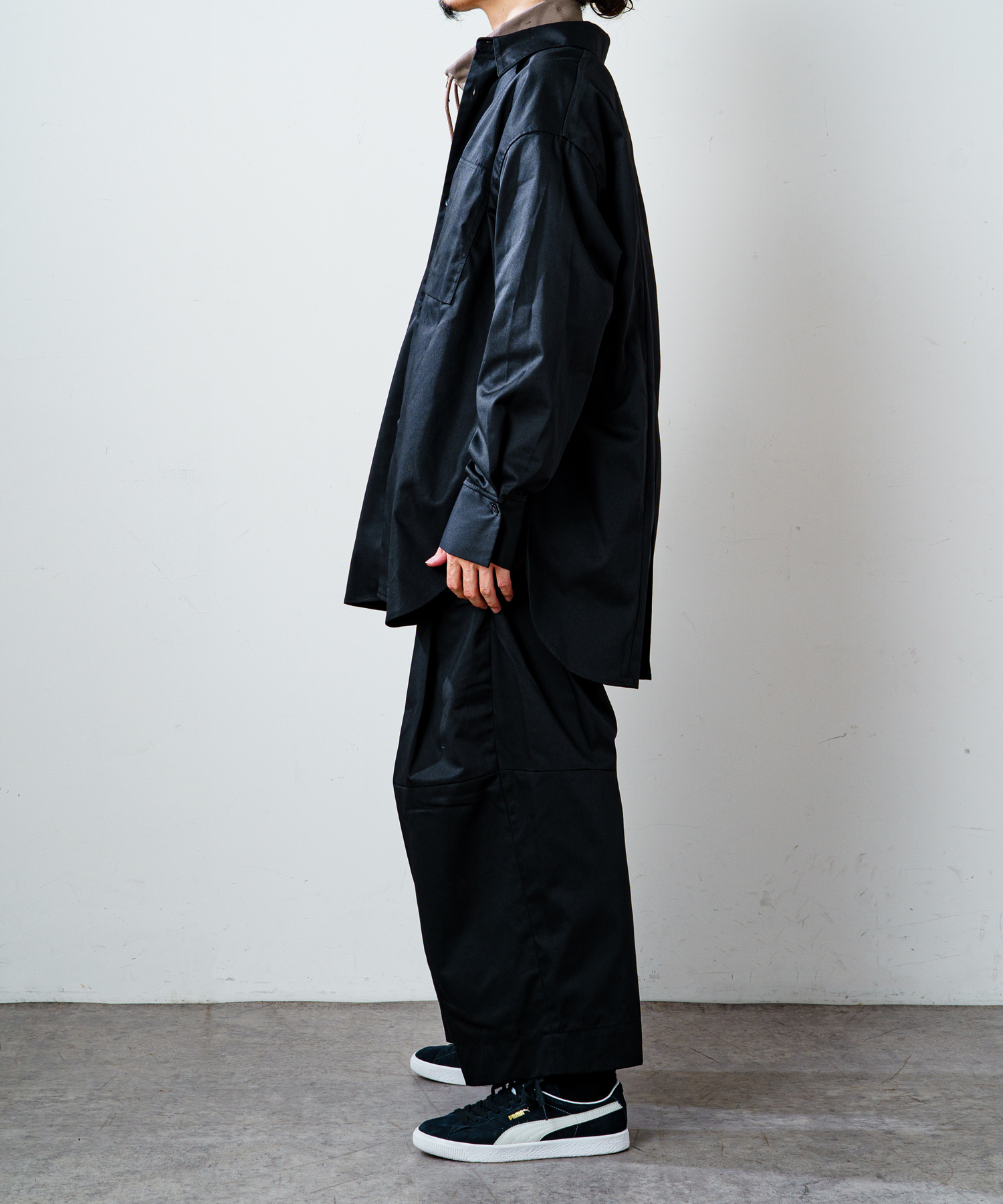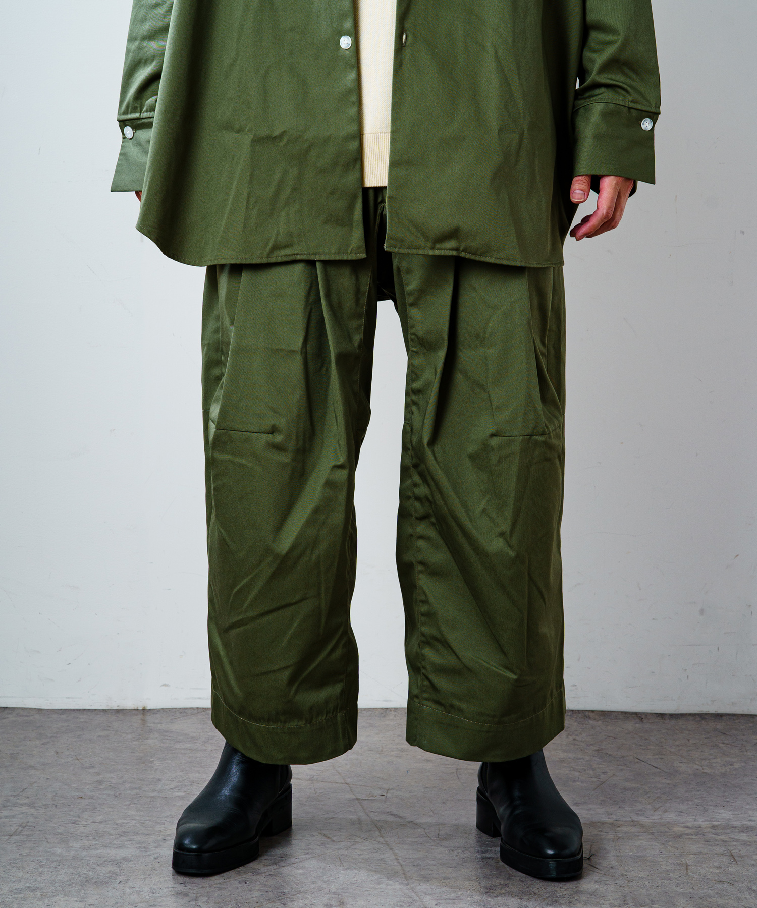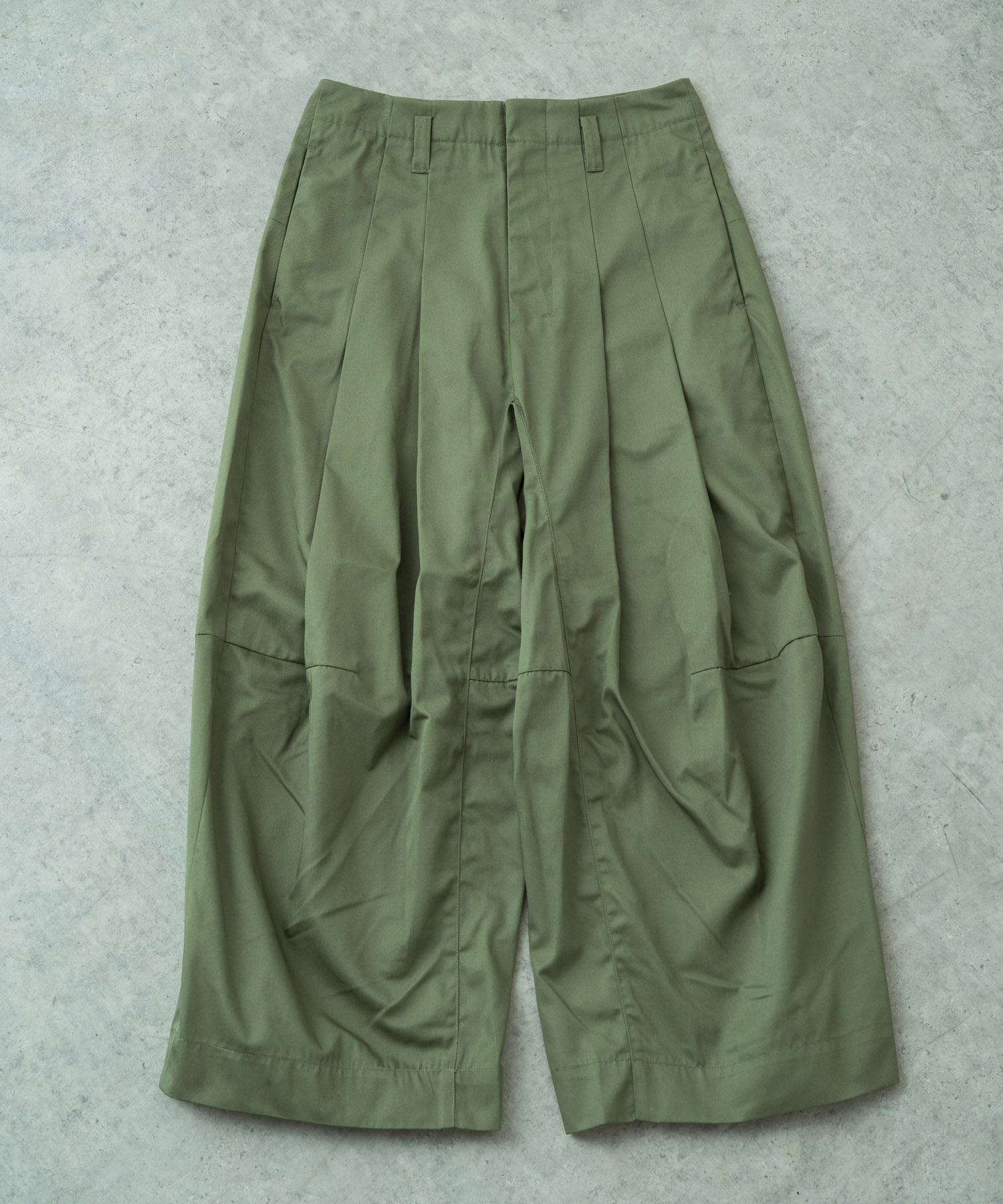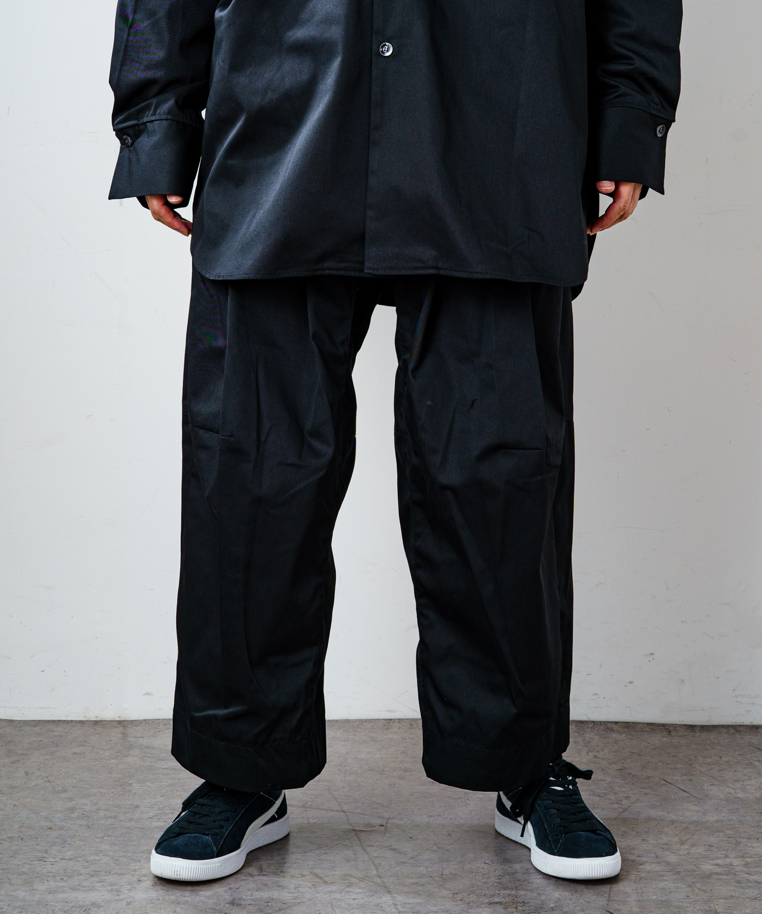 一般的には「バギーパンツ」ですが、ブランドではあえて「バギー」と呼んでおり、取扱店舗やファンの間で呼び方が定着した、アイコンアイテム。深いアウトタック(2tuck)で全体のワイドシルエットの輪郭を構築しながら、腰下(ヒップ周り)からタックによる膨らみが出る立体的なパターンが最大の特徴であり魅力ある1本。腰回り(ヒップ周り)が非常にスッキリしているため、ヒップ部分の変な膨らみは解消しながら、太もも周りからワイドシルエットを創り出しております。