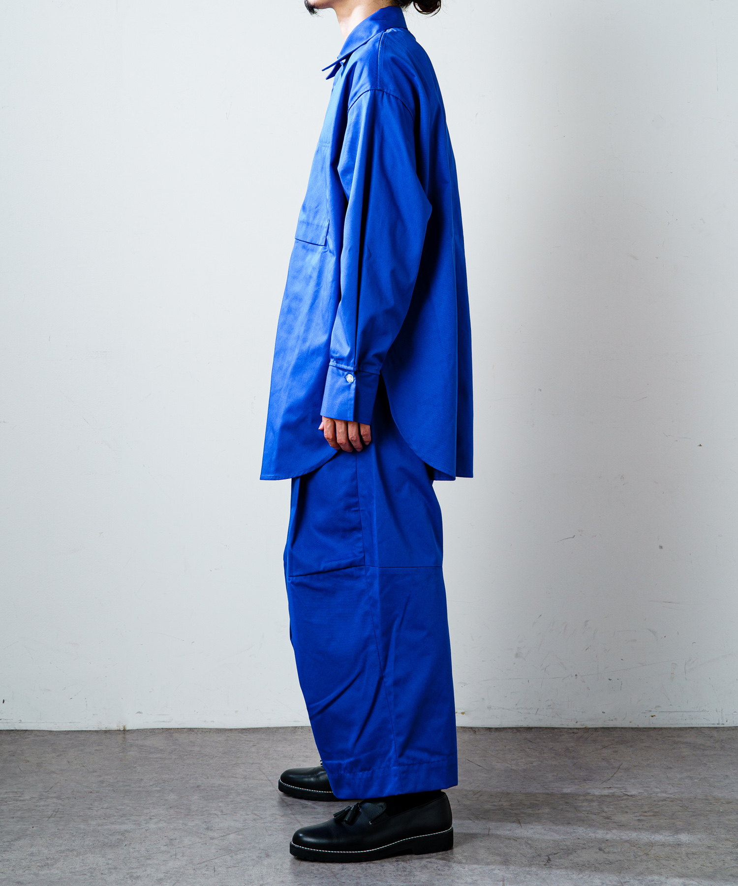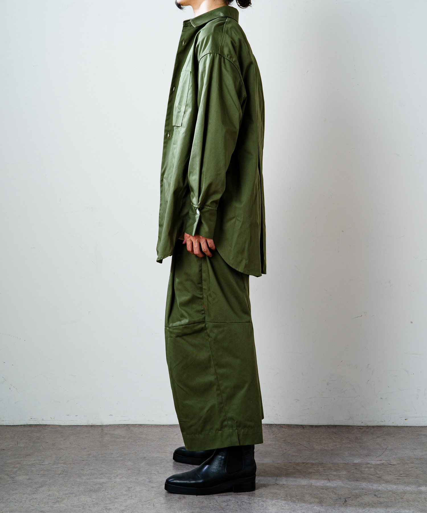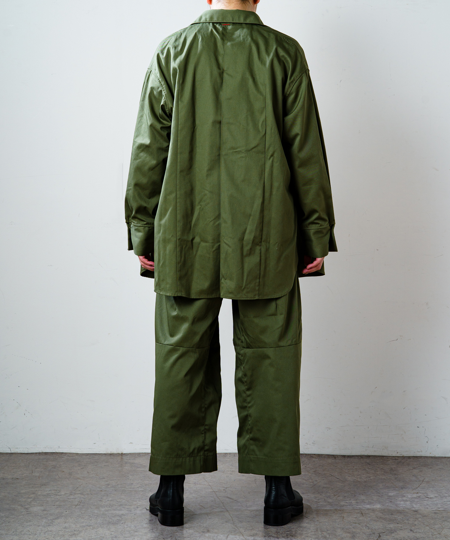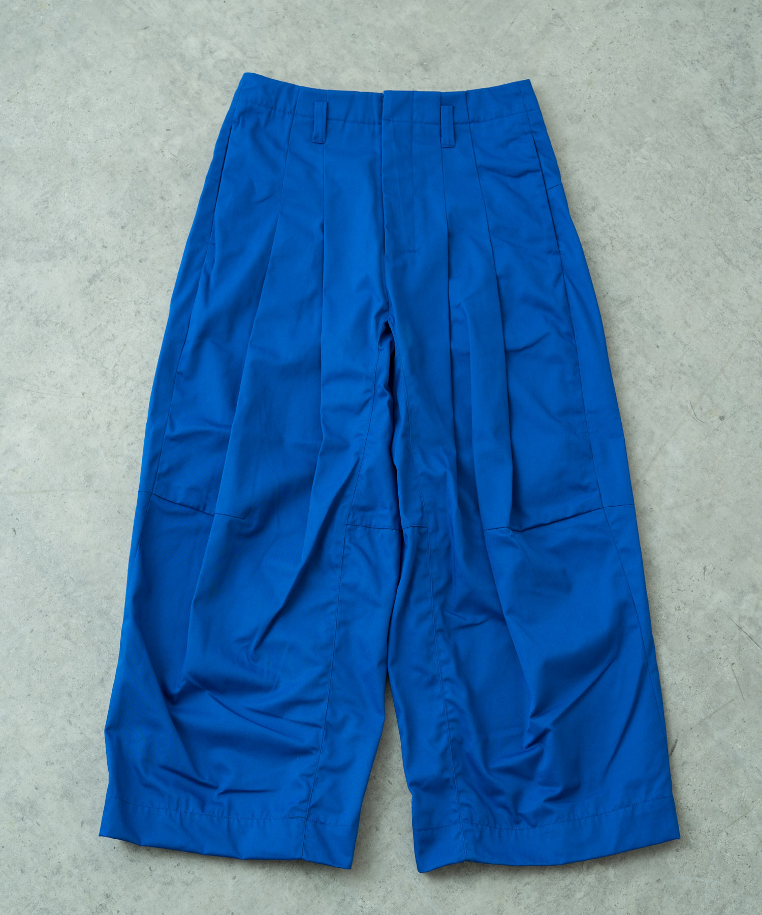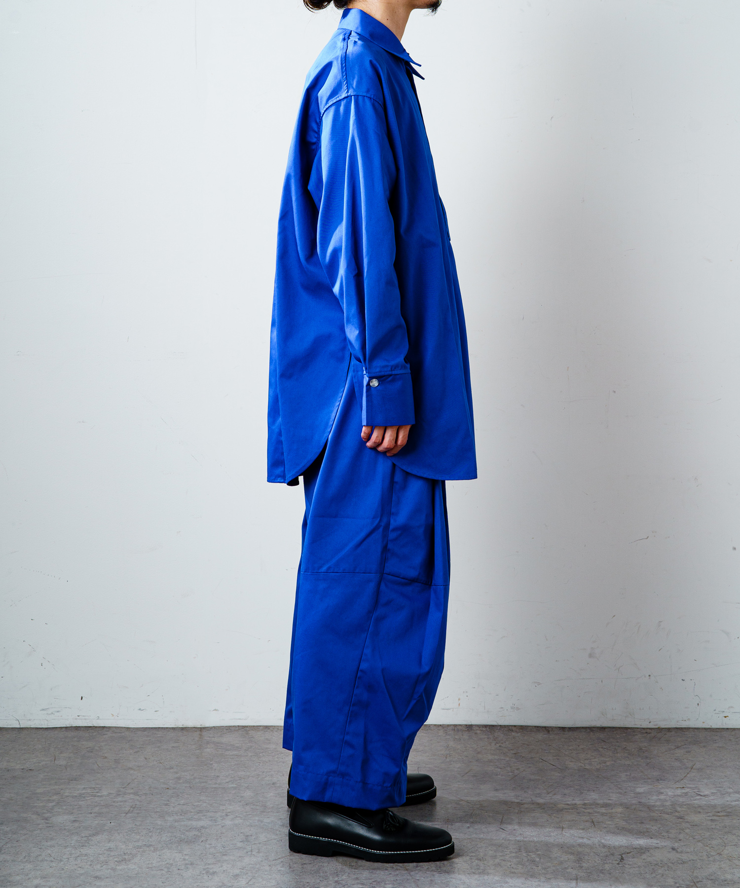 一般的には「バギーパンツ」ですが、ブランドではあえて「バギー」と呼んでおり、取扱店舗やファンの間で呼び方が定着した、アイコンアイテム。深いアウトタック(2tuck)で全体のワイドシルエットの輪郭を構築しながら、腰下(ヒップ周り)からタックによる膨らみが出る立体的なパターンが最大の特徴であり魅力ある1本。腰回り(ヒップ周り)が非常にスッキリしているため、ヒップ部分の変な膨らみは解消しながら、太もも周りからワイドシルエットを創り出しております。