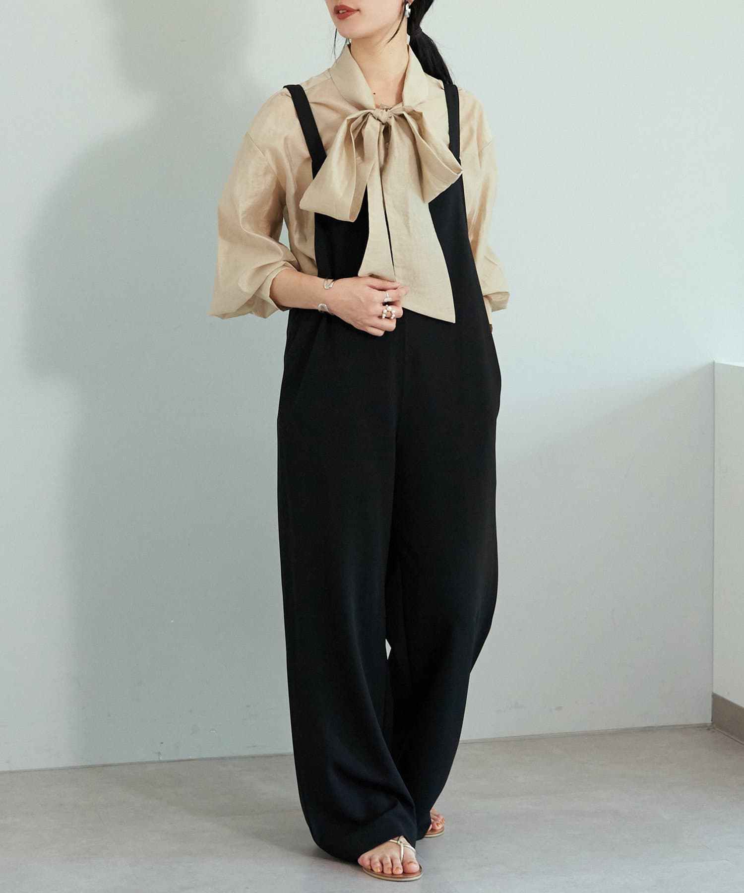 カジュアルな印象のサロペットと合わせて、キレイめにまとめたり、色んなコーディネートが楽しめそう。肌触りもよく、着やせして見えるところもポイント高いです。