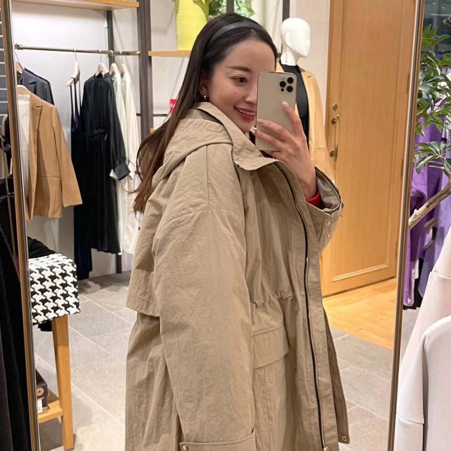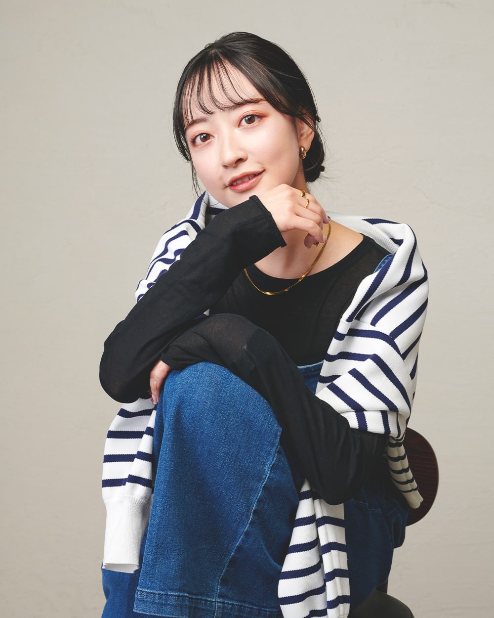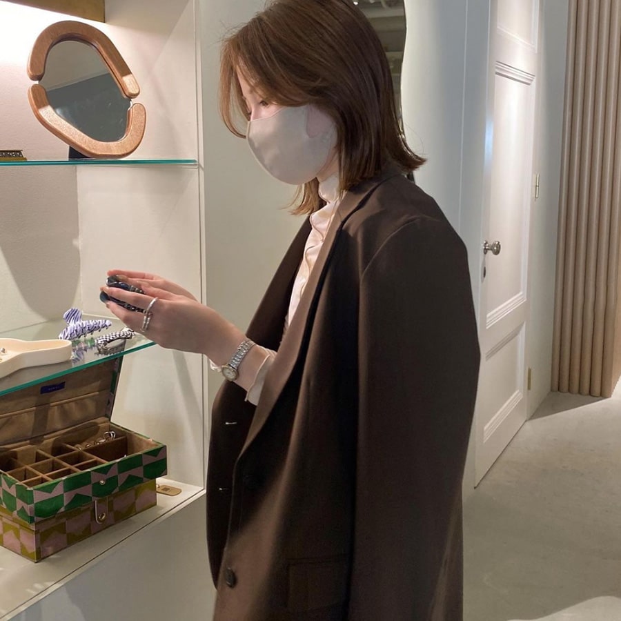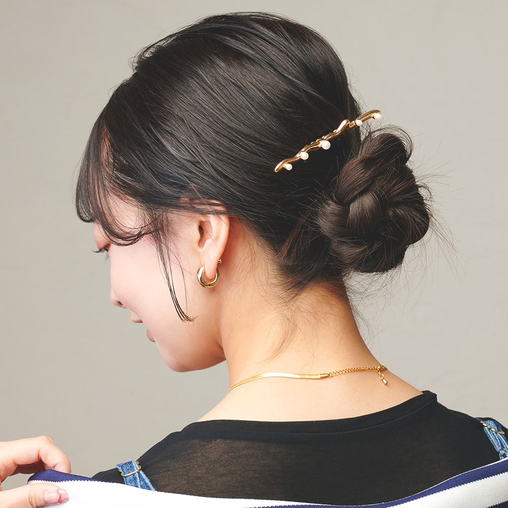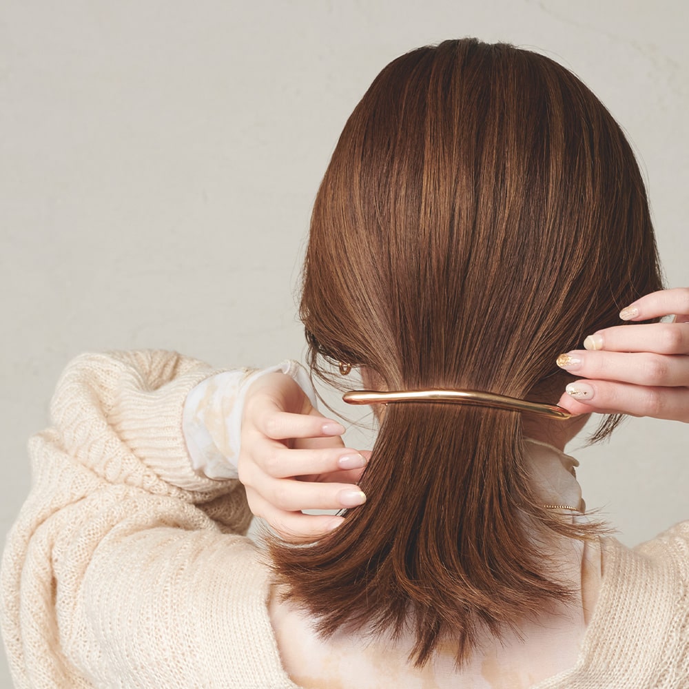 HAIR STYLE POINT 春はやっとレイヤードコーデが楽しめる時期になるので、ヘアスタイルはできるだけシンプルなまとめ髪に。また、ツヤ感がプラスされるのでバームにオイルを混ぜて馴染ませています。
