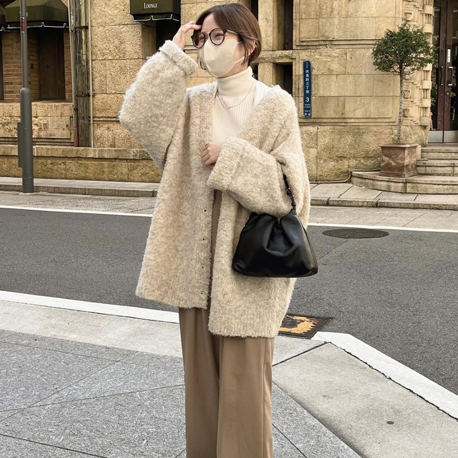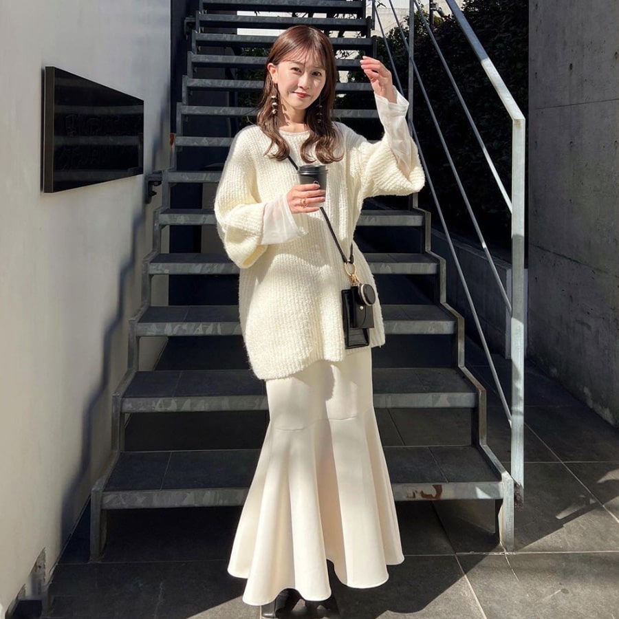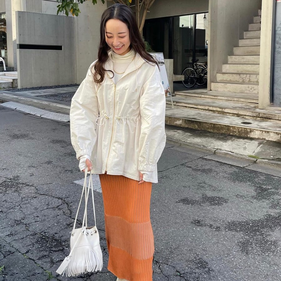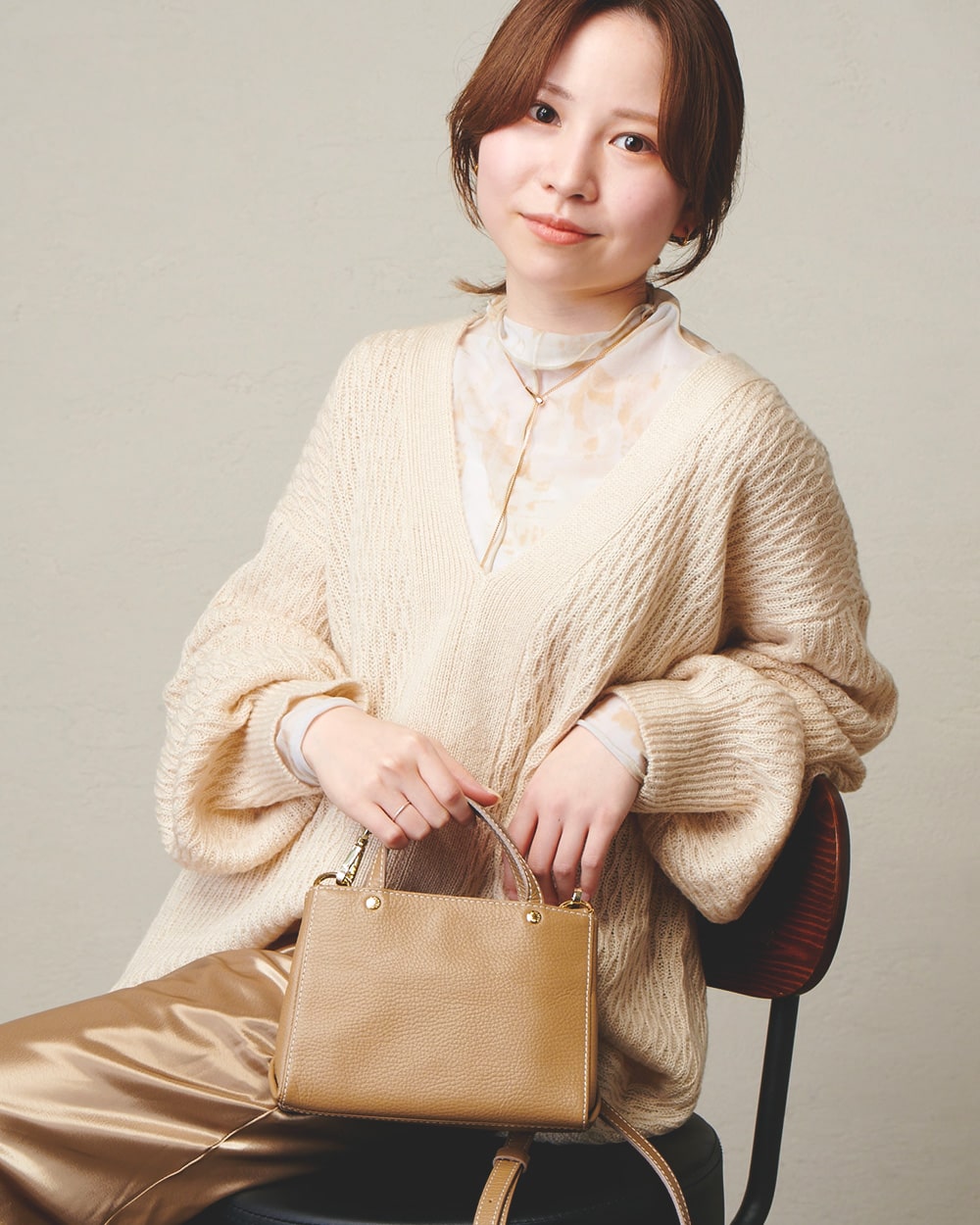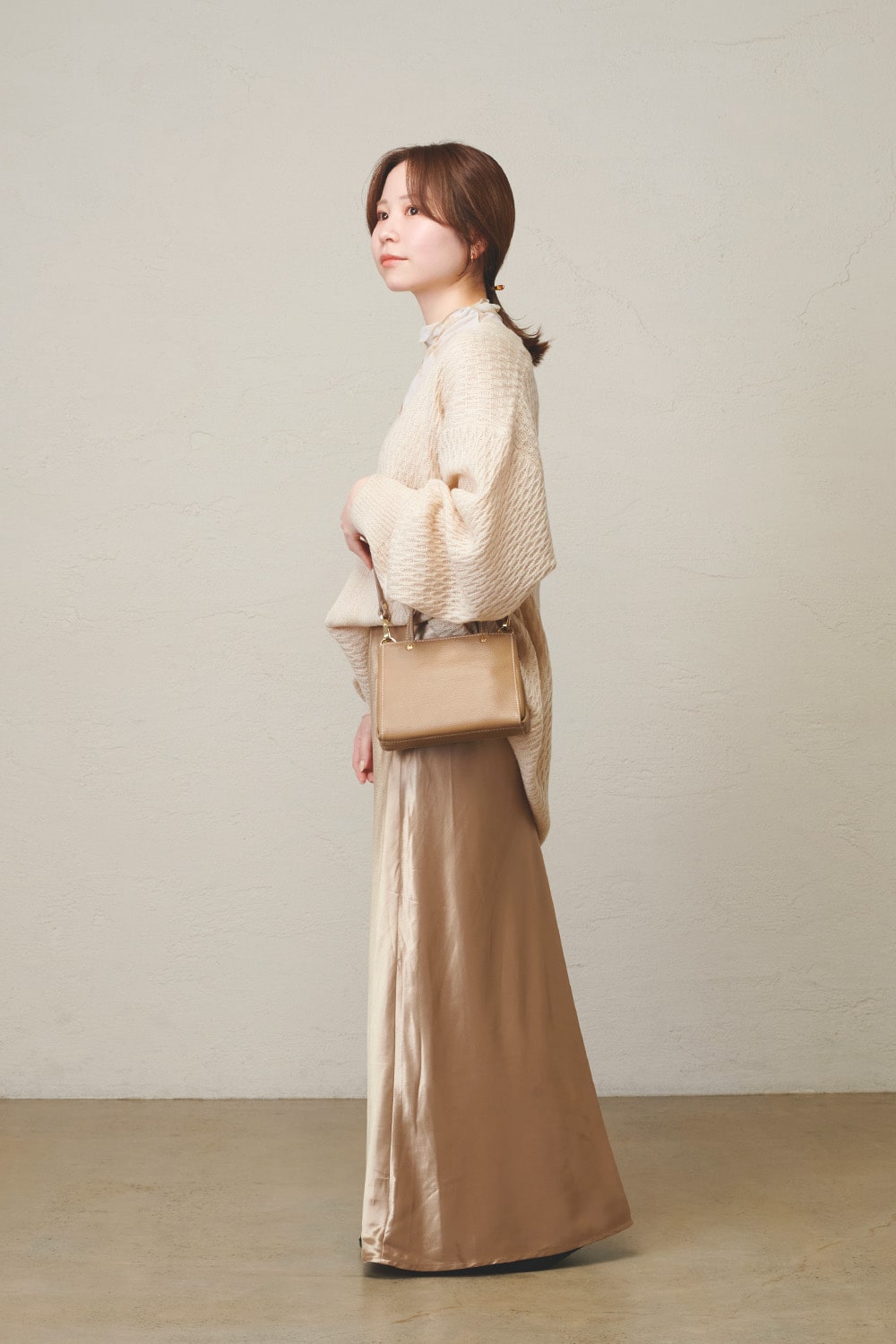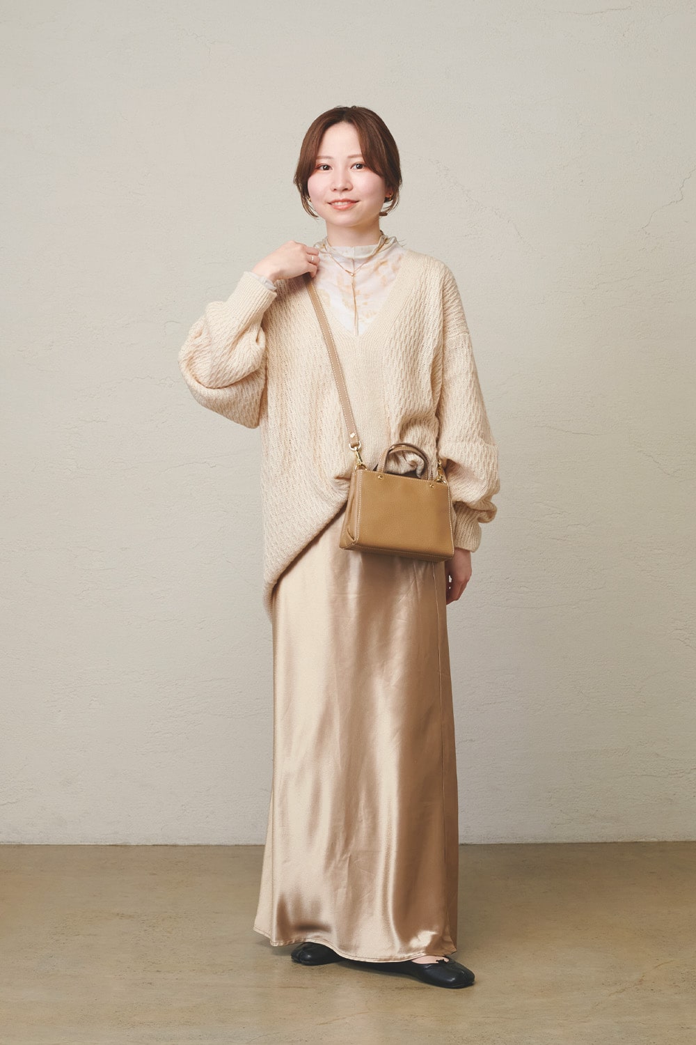 ” Real buy coordinateリアルバイしたモカのショルダーバッグに合わせたベージュのワントーンコーデがポイント。今季もトレンドの小さめバッグはレイヤードスタイルにも馴染むのでお気に入りです。また、春はきらっとしたイメージがあるのでサテンスカートを取り入れてみました。
