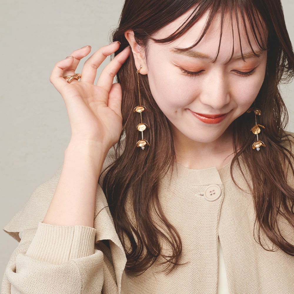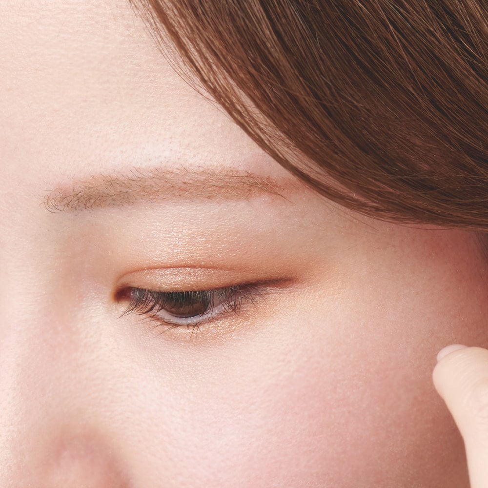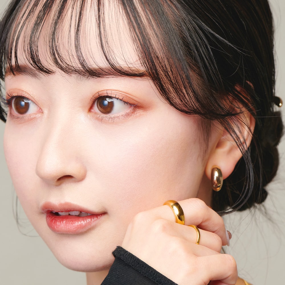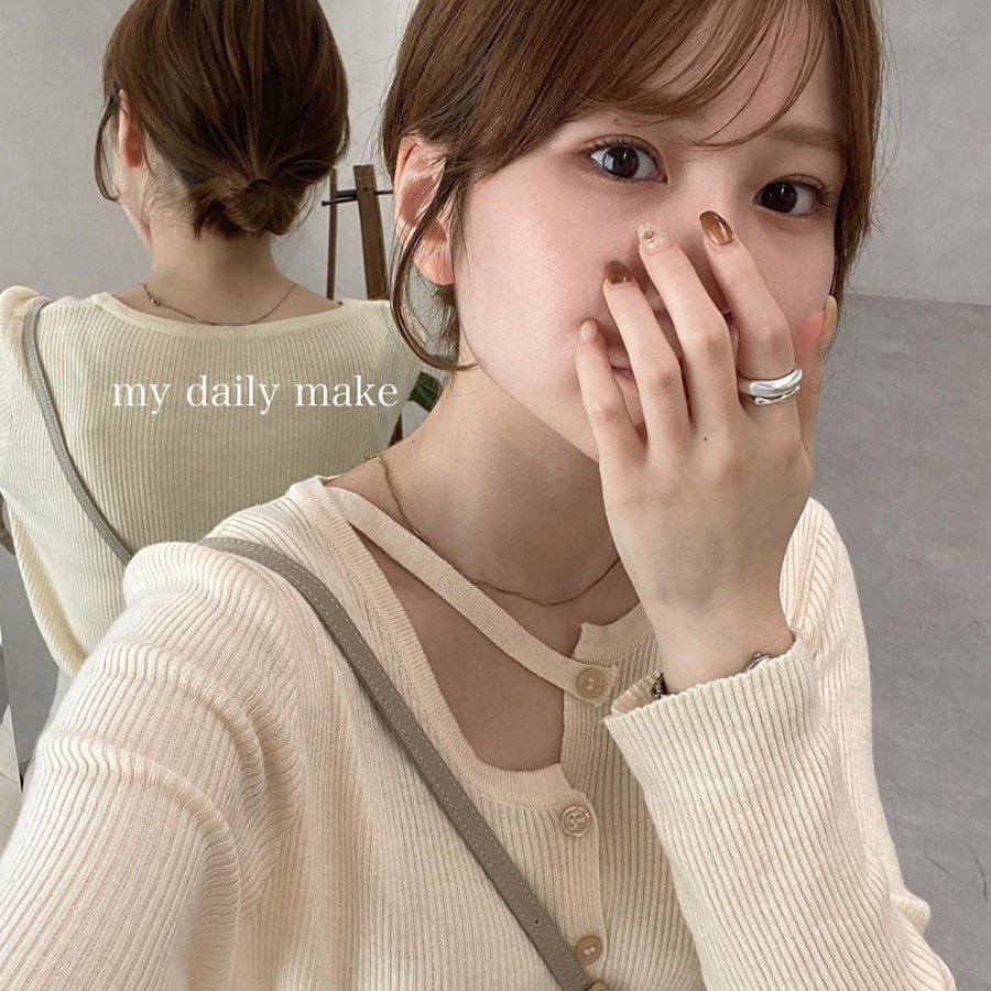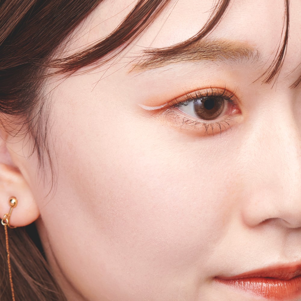 MAKE UP POINT 素肌感のある肌に憧れているのでベースはなるべく下地だけで適度なツヤ肌を心がけています。また、アイメイクは春っぽくコーラル系に、ポイントでラメを取り入れてみました。アイブロウもピンクブラウンで統一感を出しているのもポイントです。