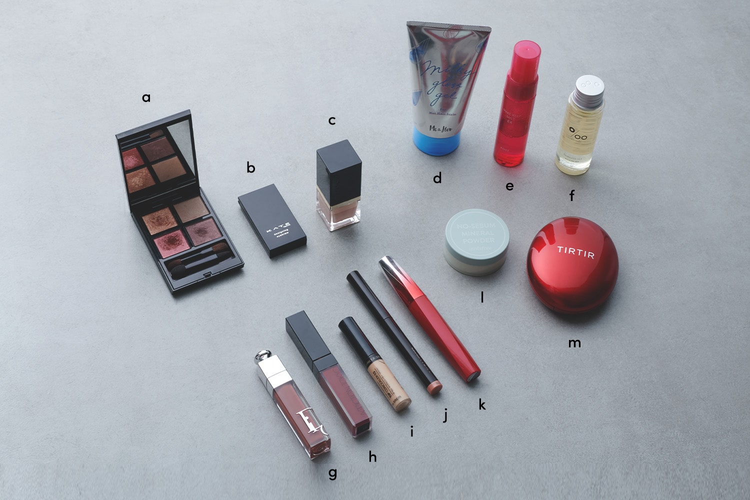 a.ADDICTION:アイシャドウパレット 006 First Romance / b.KATE:デザイニングアイブロウ3D / c.SUQQU:シマー リクイド ハイライター 01 桃艶 / d.Me&Her:ミルキィグロスジェル / e.KOSE:メイクキープミスト EX / f.Promille:プロミルオイル / g.Dior:アディクト リップ マキシマイザー 018 インテンス スパイス / h.ADDICTION:ザ マット リップ リキッド 011 Carmine Red / i.the SAEM:CPチップコンシーラー 1.5 / j.LAURA MERCIER:キャビアスティックアイカラー 40 ヌードローズ / k.dejavu:「塗るつけまつげ」ロングタイプ モーヴブラック / l.TIRTIR:Mask fit Cushion RED21N / m.TIRTIR:Mask fit Cushion RED21N