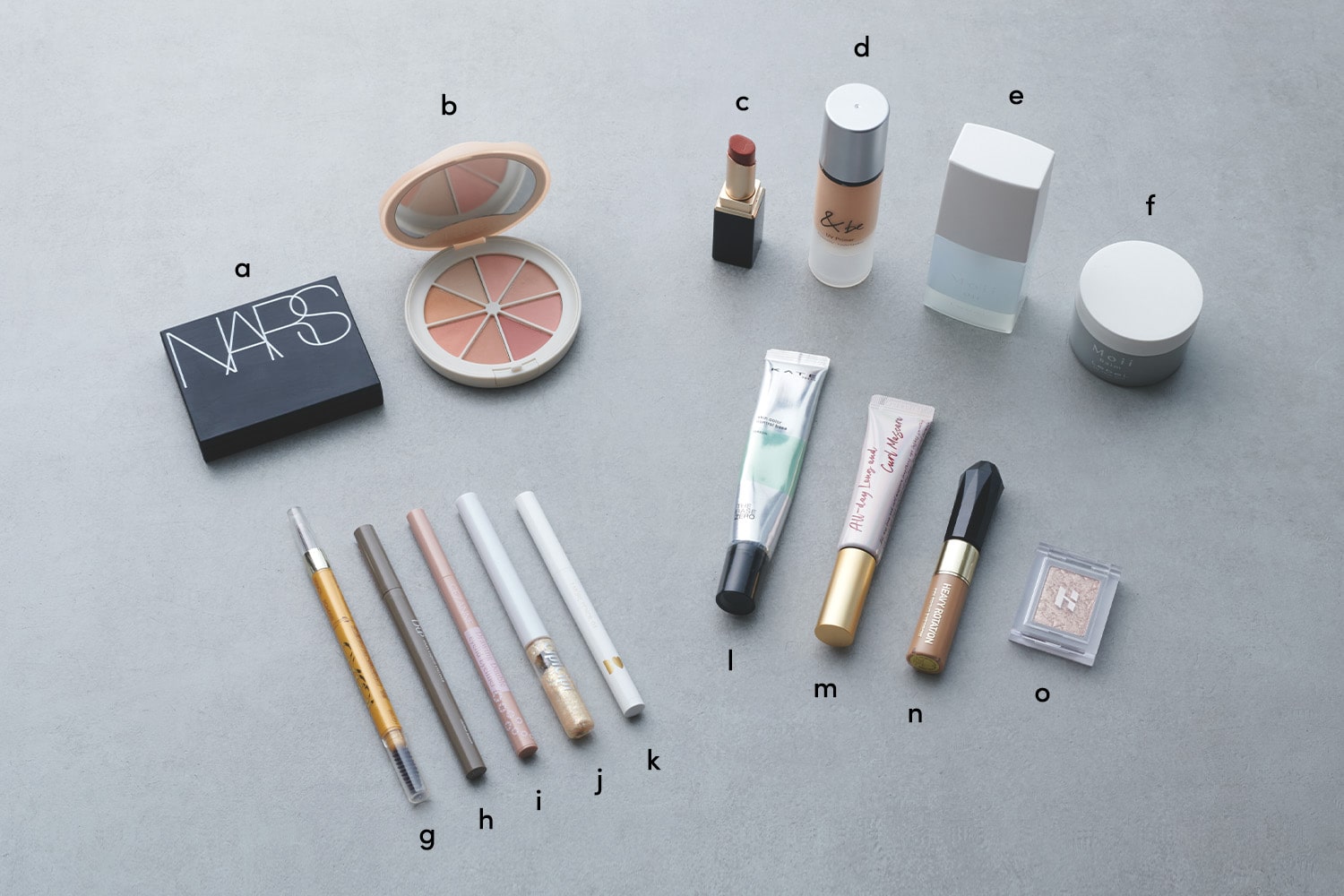 a.NARS:ライトリフレクティングセッティングパウダー プレスト N / b.LAKA:ミドルトーンコレクターアイシャドウパレット 01 Sunny / c.SUQQU:バイブラント リッチ リップスティック 08 冴褐色 / d.&be:UVプライマー / e.LebeL:モイ オイル レディアブソリュート / f.LebeL:モイ バーム ウォークインフォレスト / g.excel:パウダー&ペンシル アイブロウEX PD10 ピンクブラウン / h.D-UP:シルキーリキッドアイライナーWP シフォンブラウン / i.セザンヌ:描くふたえアイライナー 30 影用ピンク / j.CipiCipi:グリッターイルミネーションライナーR 02 Twinkle Star / k.B IDOL:1more ペンシル 04 スポットハイライト アイボリー / l.KATE:スキンカラーコントロールベース green / m.Milk Touch:オールデイロングアンドカールマスカラ ブラウン / n.HEAVY ROTATION:カラーリングアイブロウR 03 アッシュブラウン / o.Holika Holika:マイフェーブピースアイシャドウ Moon shine