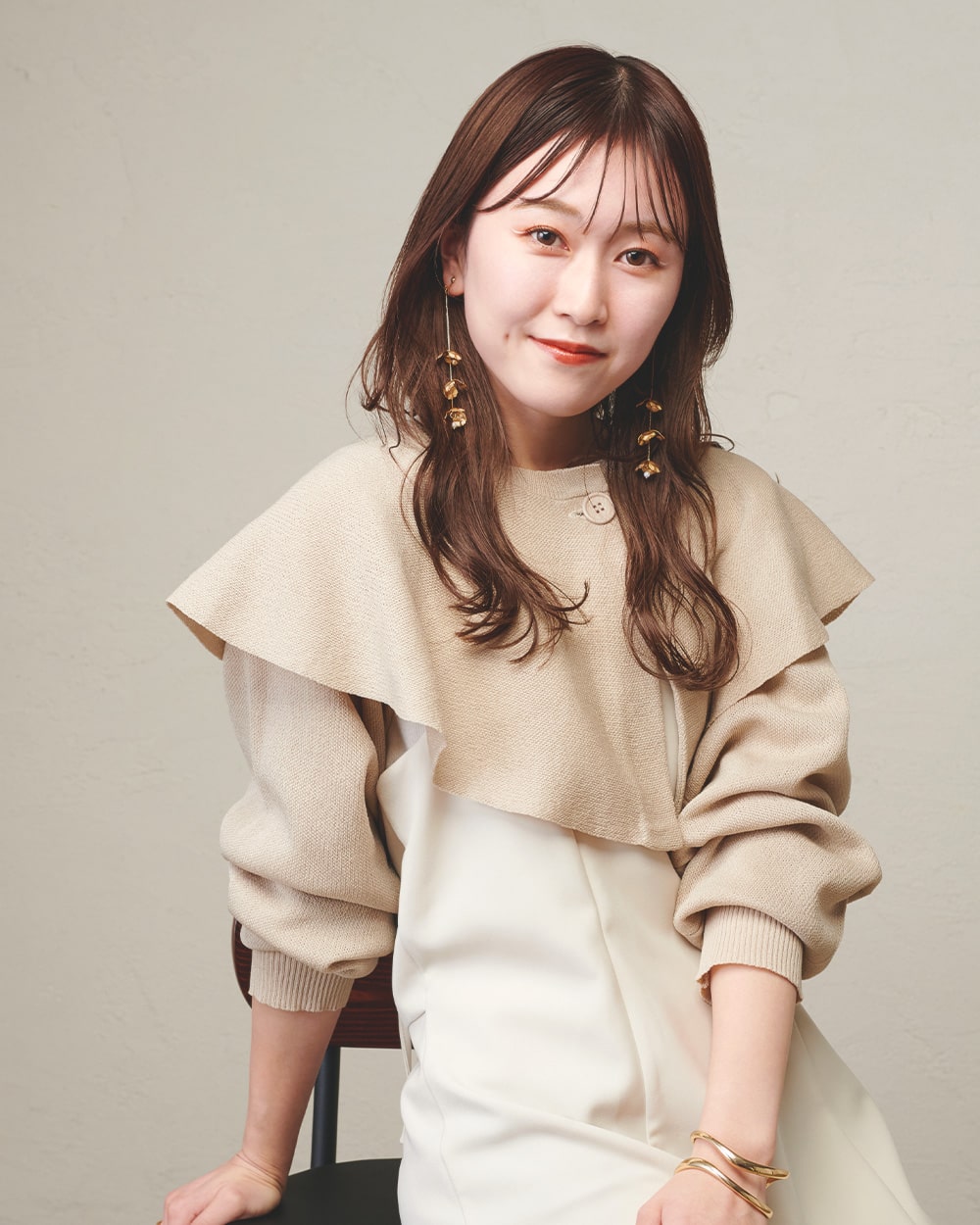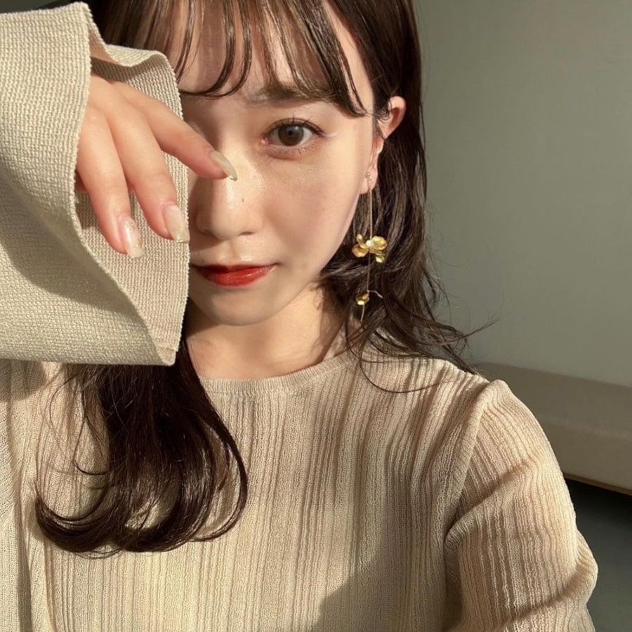 HAIR STYLE POINT 最近は透明感を出せるよう少し暗めのカラーにしています。ゆる巻きでどんなコーデにも馴染みやすい巻き方がポイント。前髪は少しオイルで束感を作り、大人っぽい雰囲気になるように意識しています。