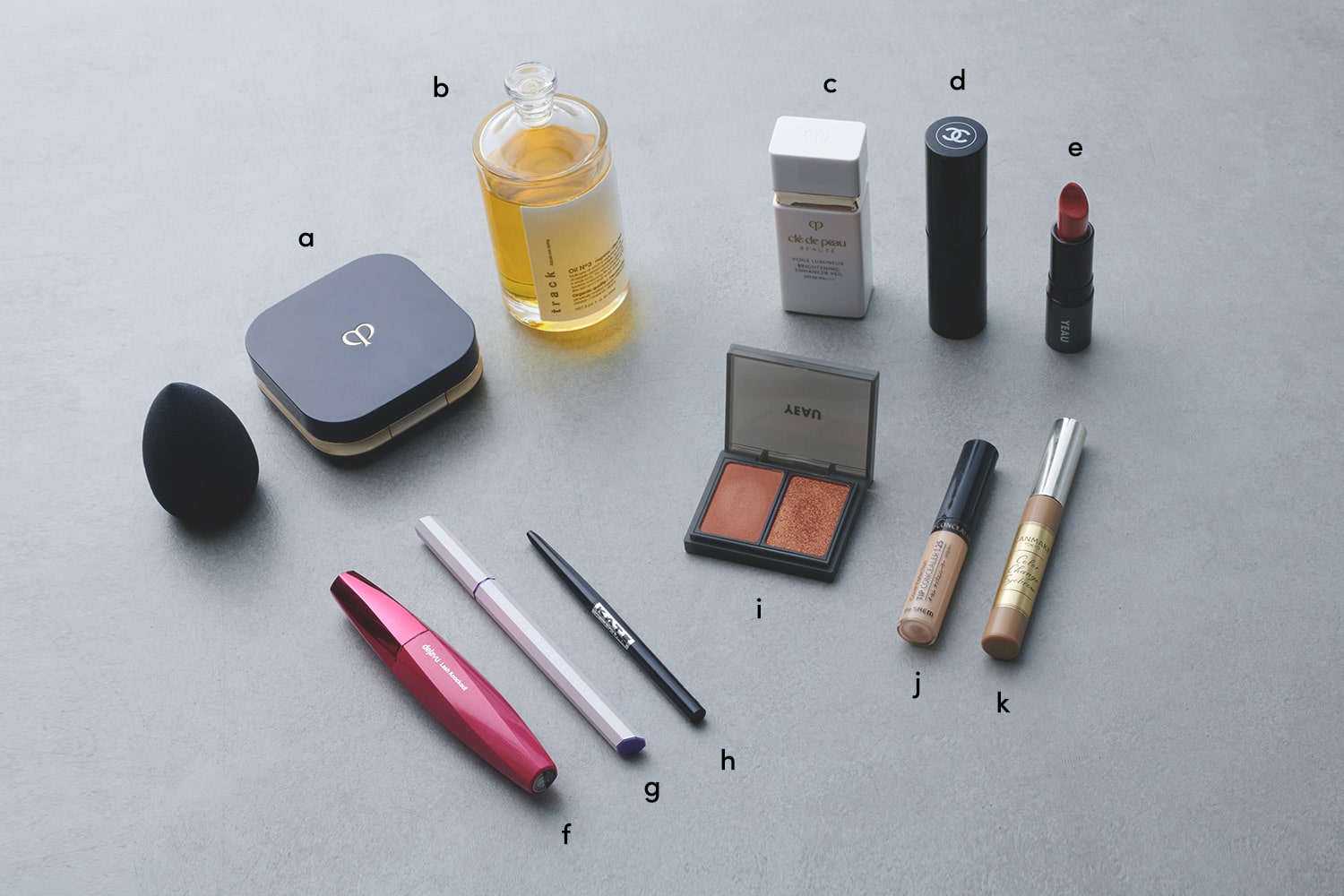 a.cle de peau:タンクッションエクラナチュレル ピンクオークル00 / b.track:track oil NO.3 / c.cle de peau:ヴォワールルミヌ / d.CHANEL:ボーム エサンシエル スカルプティング / e.YEAU:affection matte lip stick 05 / f.delavu:ボリュームマスカラ エクストラボリュームE 615 / g.UZU:アイオープニングライナー ホワイト / h.KATE:アイブロウペンシルA BR-1 明るい茶色 / i.YEAU:depict eye shadow 05 / j.the SAEM:チップコンシーラー 1.25 ライトベージュ / k.CANMAKE:カラーチェンジアイブロウ 04 モカベージュ
