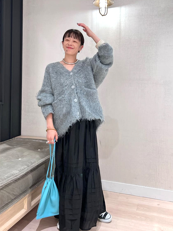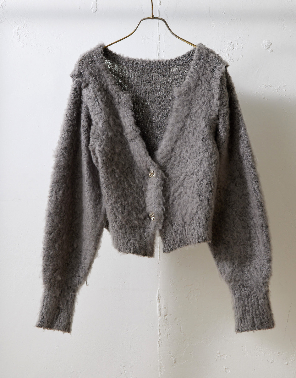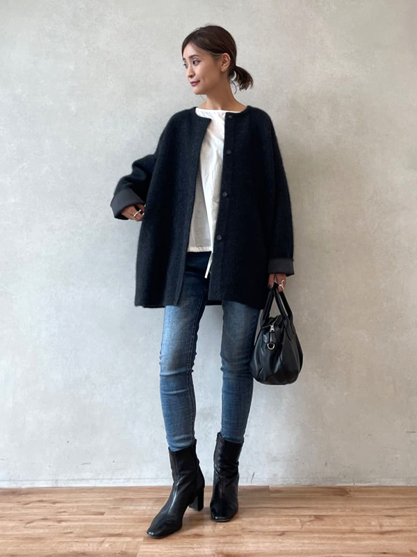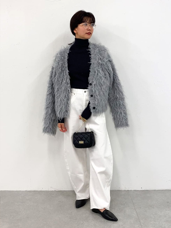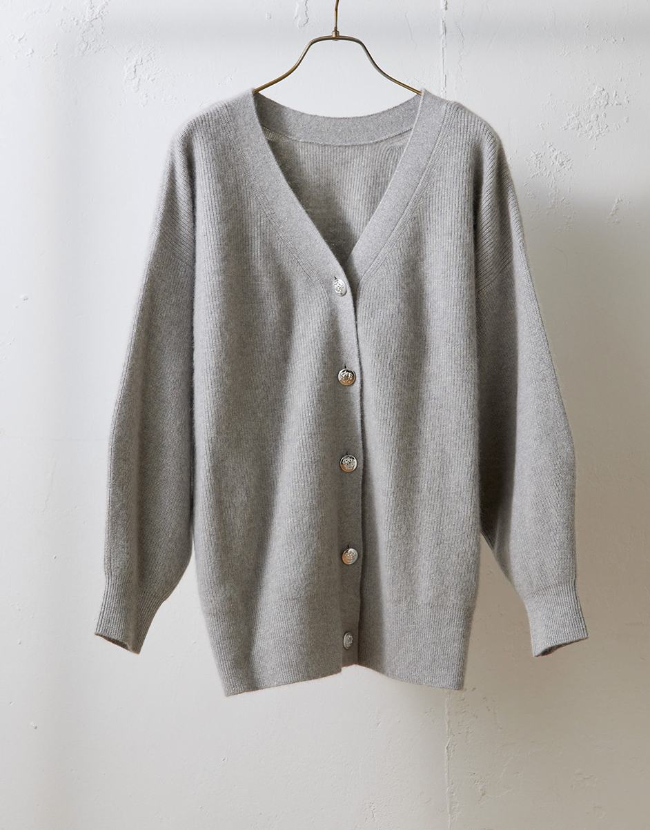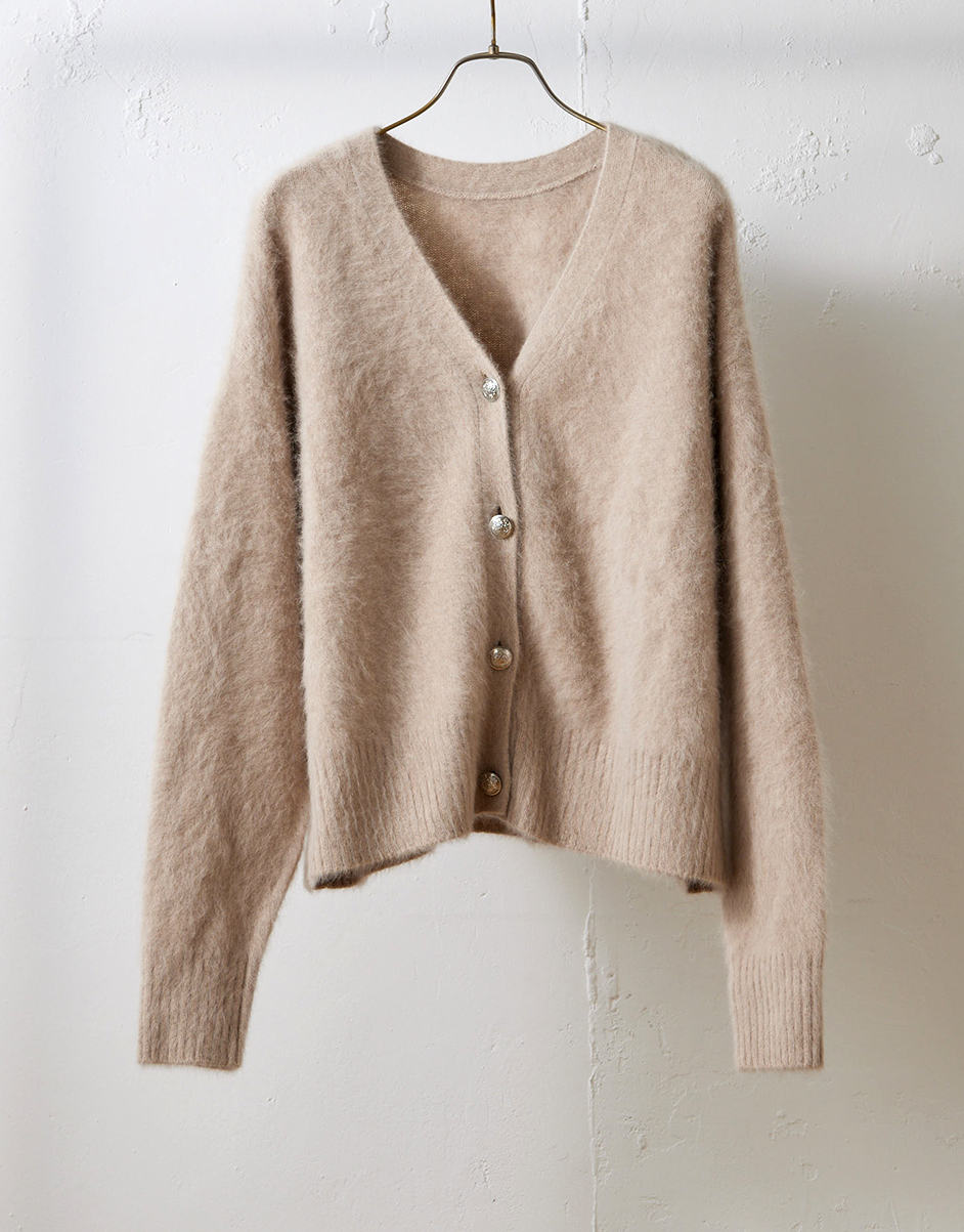 フォックス混のニットは保温性の高さが特徴なので、真冬でも軽く・暖かく着られるのがうれしいポイント。また、シルバーのコンチョボタンがシンプルなカーディガンにアクセントを付けてくれます。