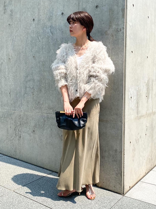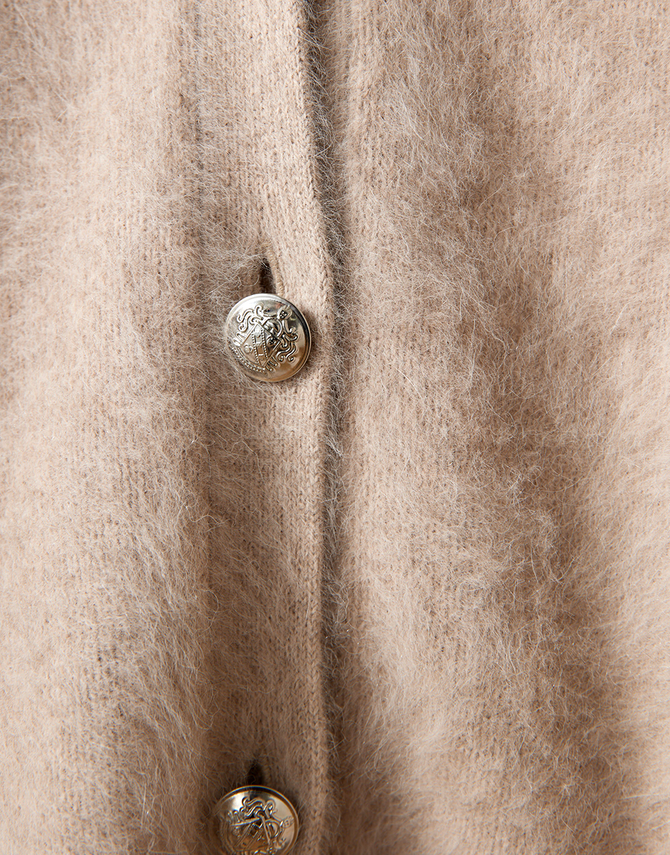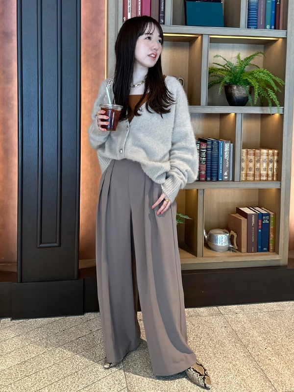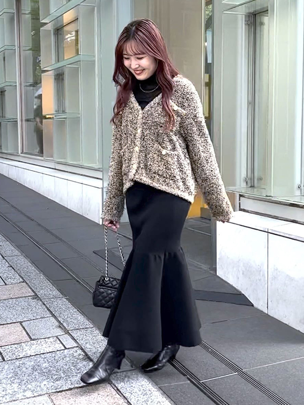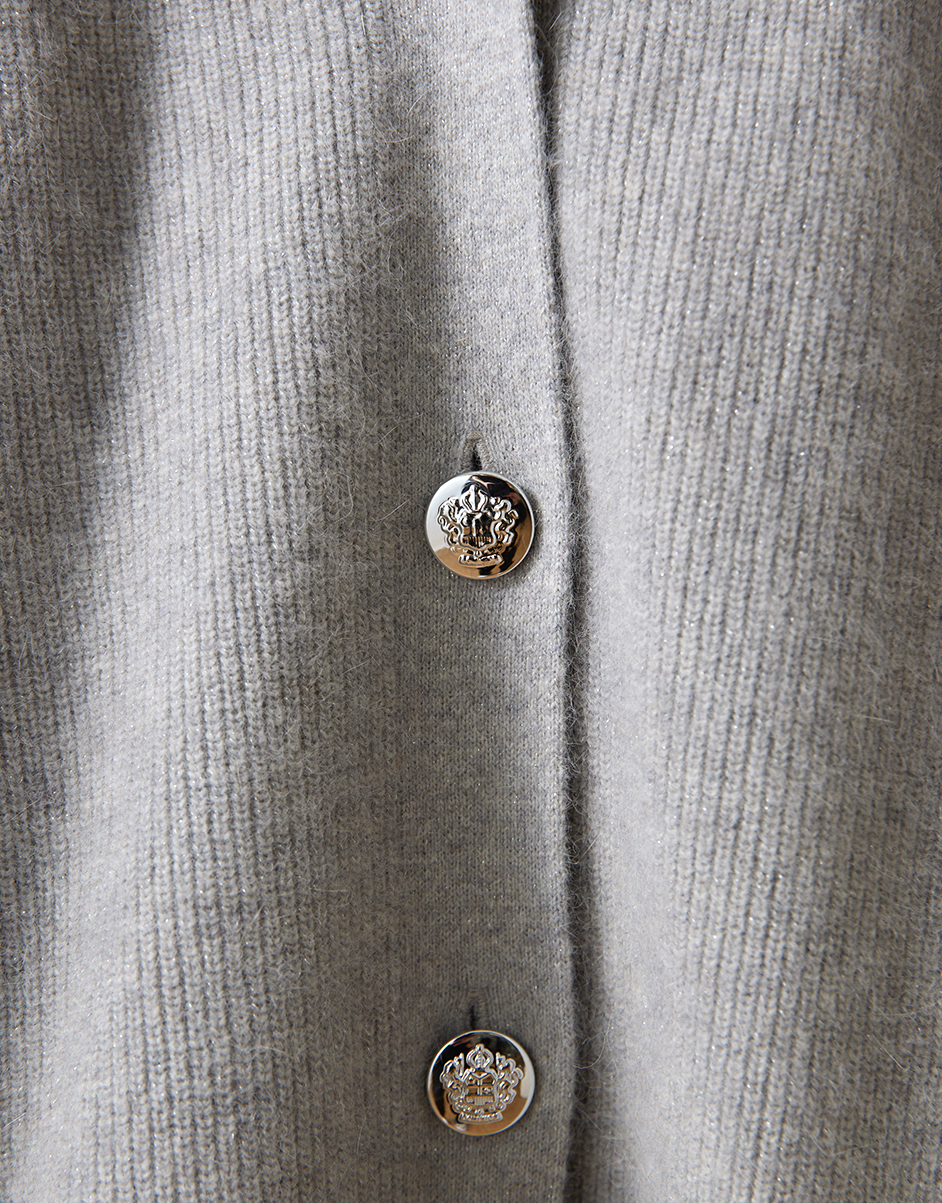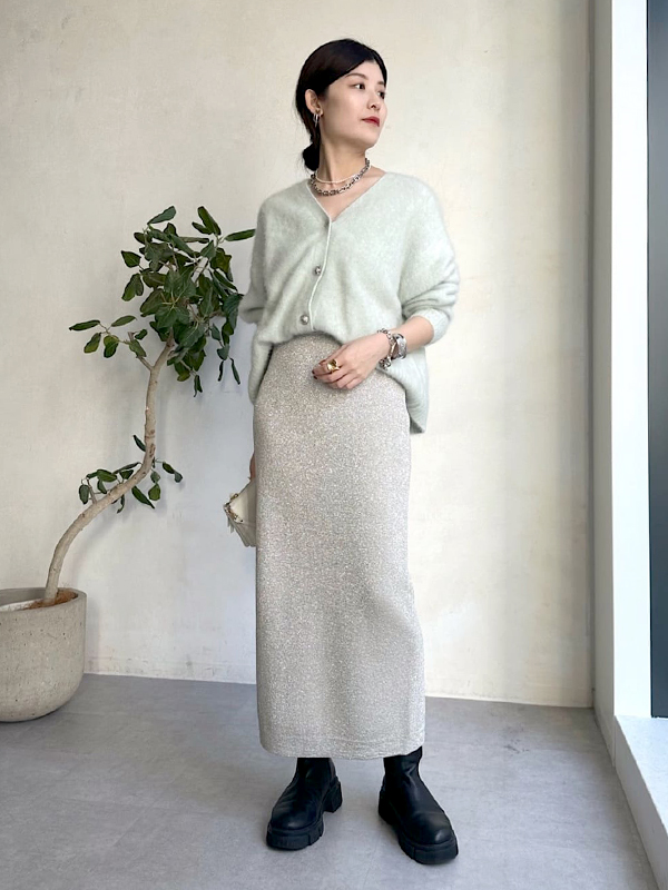 フォックス混のニットは保温性の高さが特徴なので、真冬でも軽く・暖かく着られるのがうれしいポイント。また、シルバーのコンチョボタンがシンプルなカーディガンにアクセントを付けてくれます。