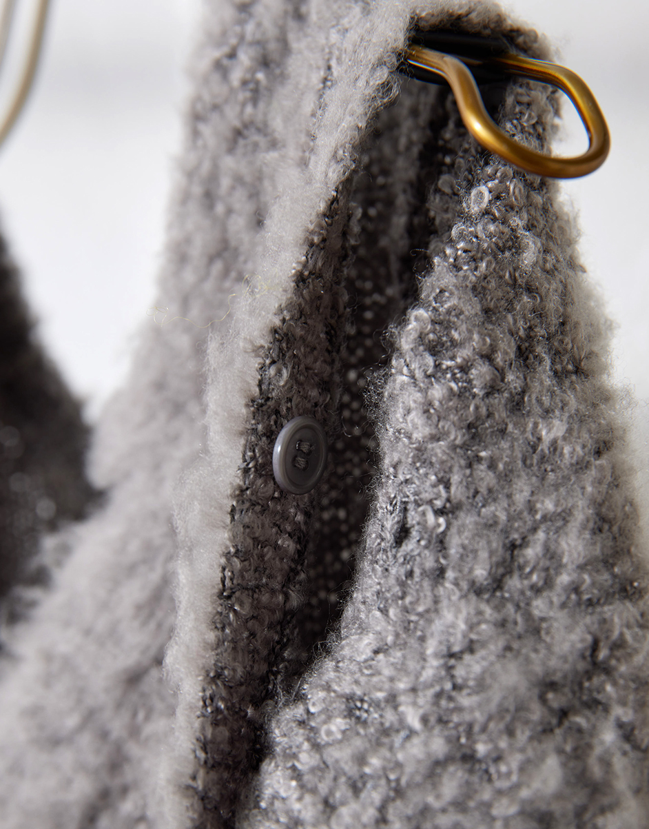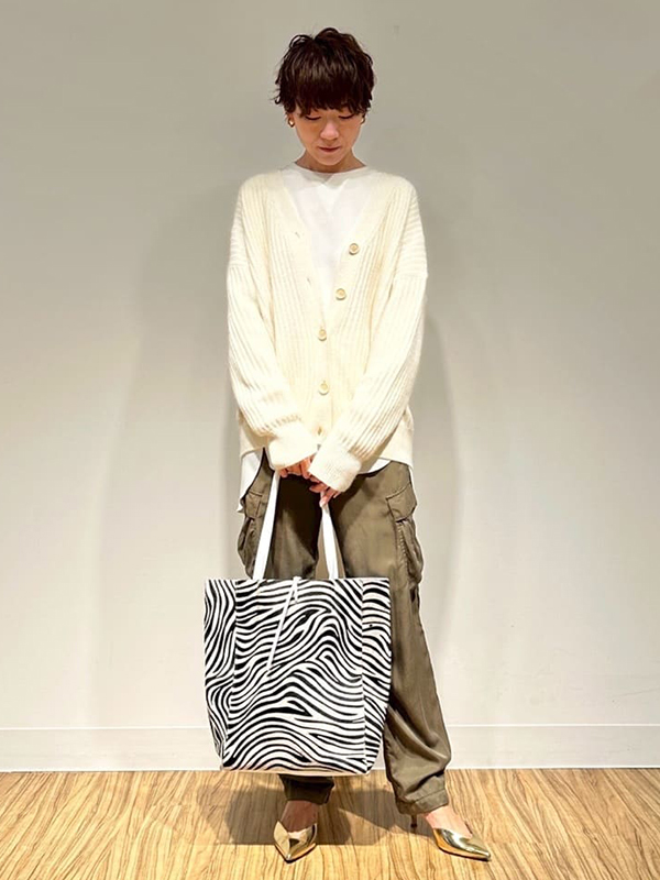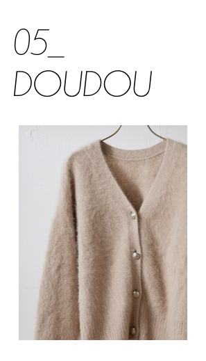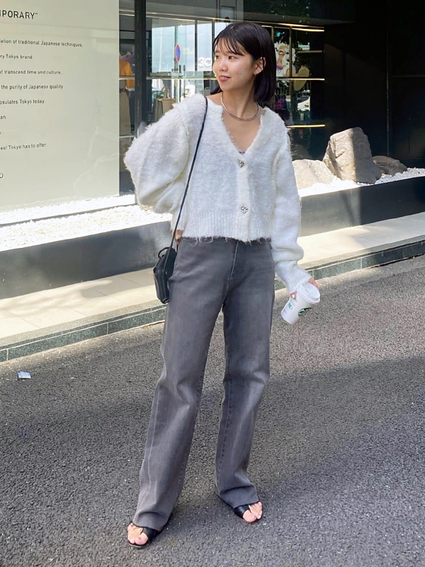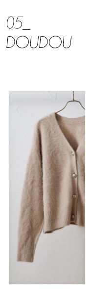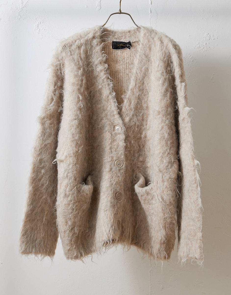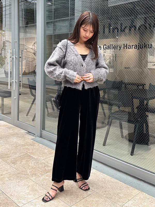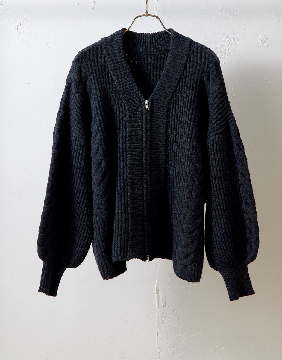 フォックス混のニットは保温性の高さが特徴なので、真冬でも軽く・暖かく着られるのがうれしいポイント。また、シルバーのコンチョボタンがシンプルなカーディガンにアクセントを付けてくれます。