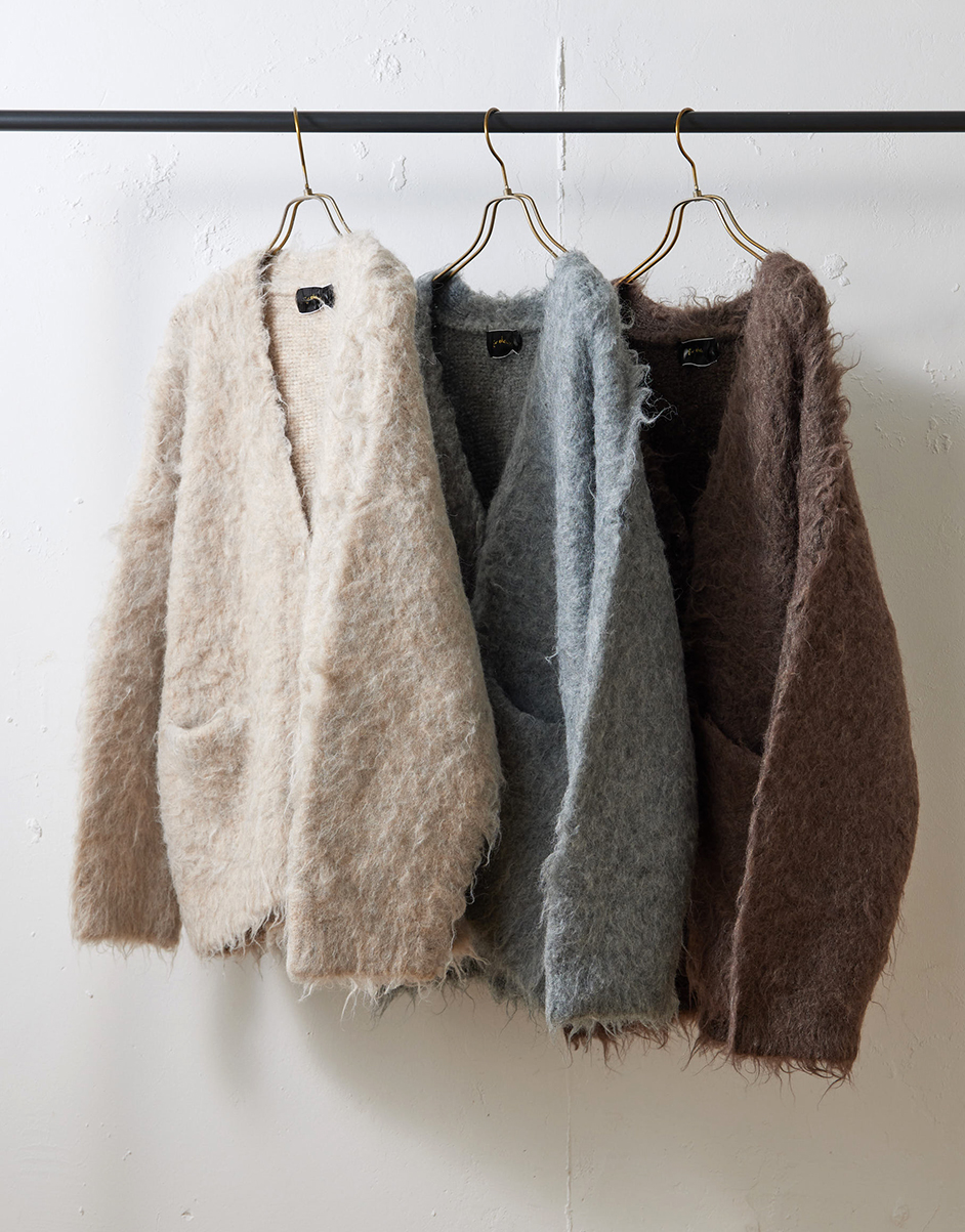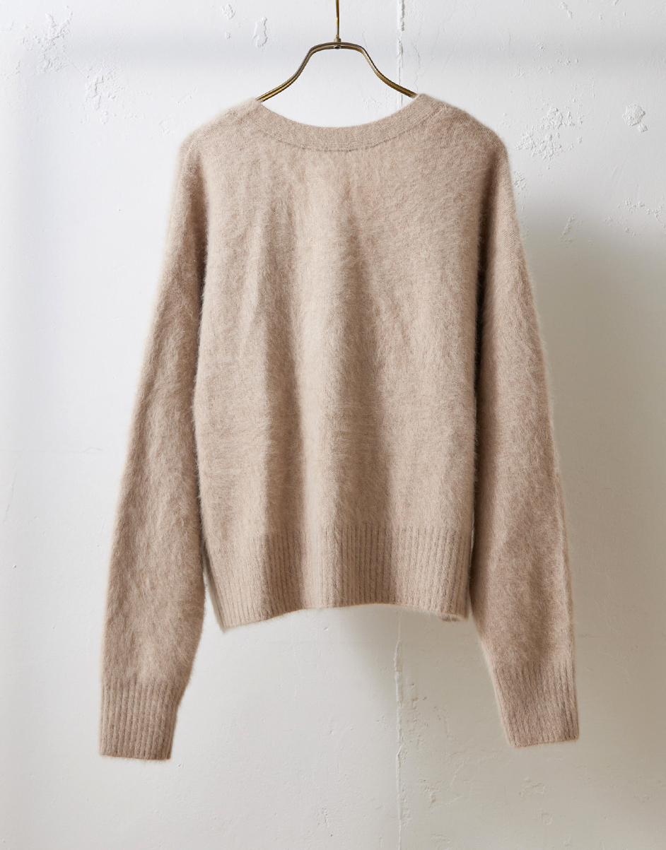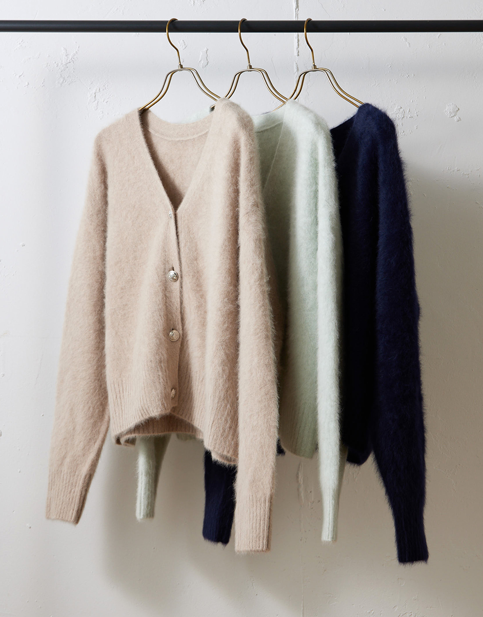ふわっとした毛足の長い高級糸にラメ糸をMIXしたトレンド感漂うカーディガン。とろみのある柔らかなタッチ、ゆるっと女性らしいフォルム、デコルテをキレイにみせてくれるVネックラインは体型・骨格問わず、着る人の「女性らしさ」を引き出してくれる、とっておきの一着です。