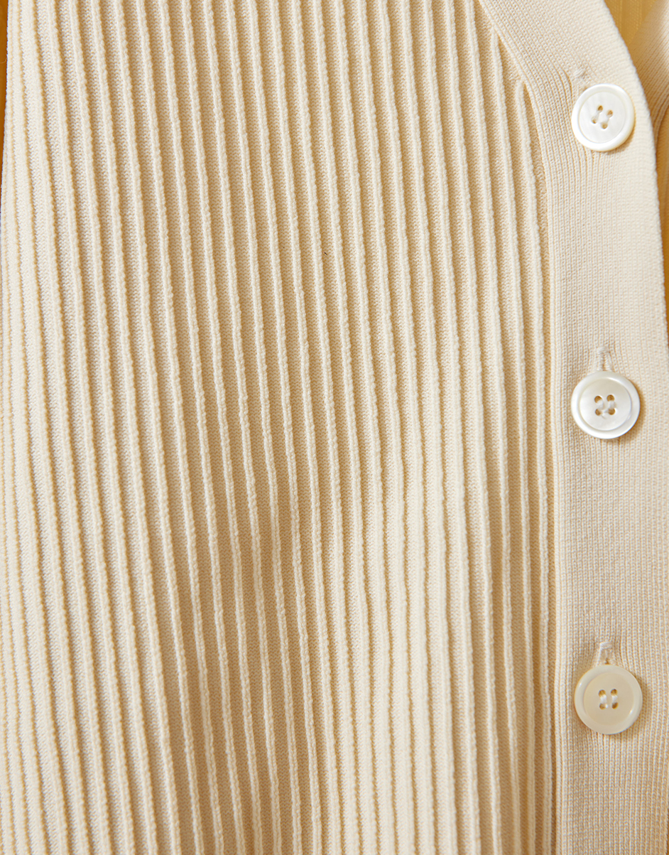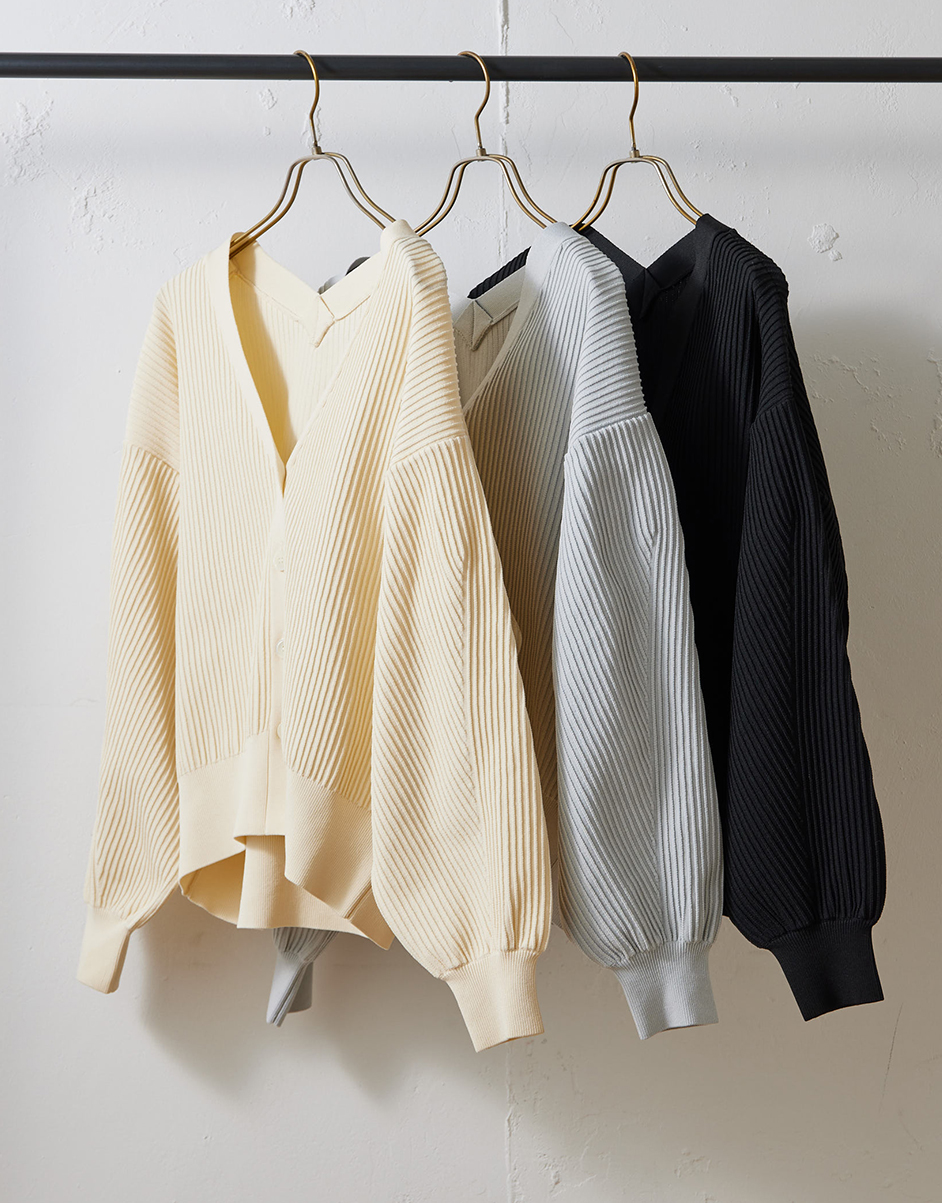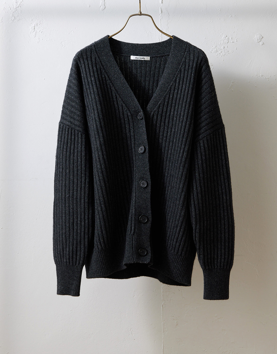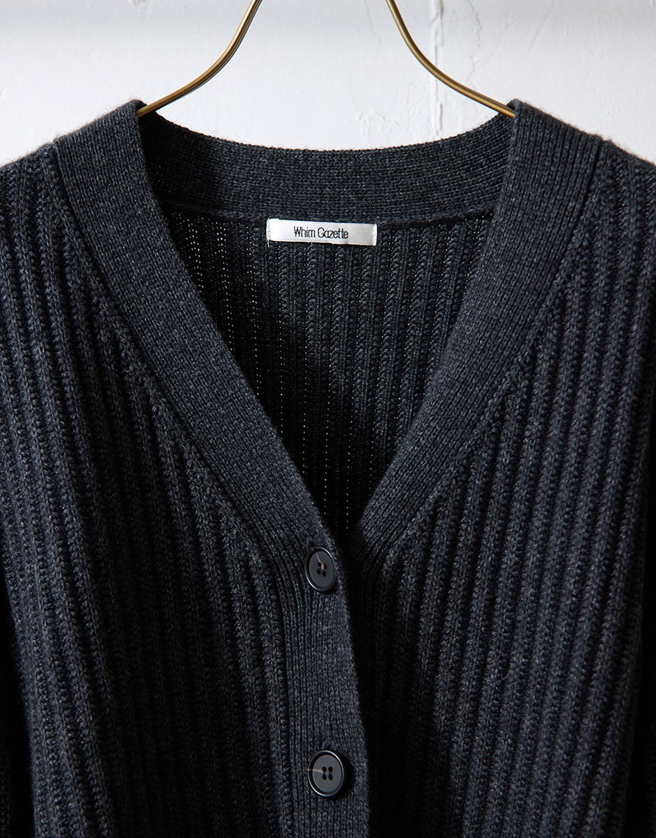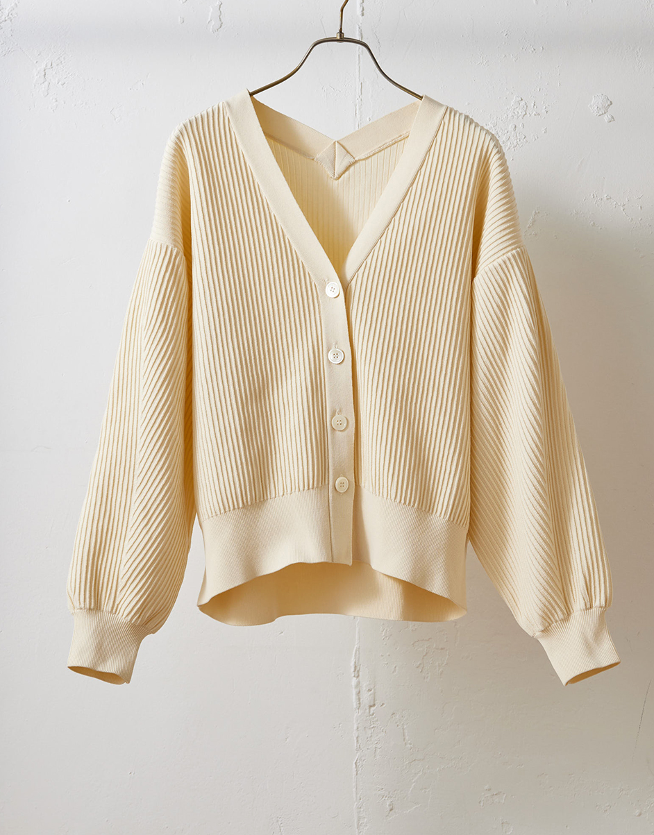 軽さが特徴のポリエステル糸を使用したリブニットカーディガン。ネック後ろ部分はV開きになっていて程よい抜け感が◎フロントのボタンを閉めてトップスとして着用していただくのもおすすめで、秋の羽織りにぴったりな一枚です。