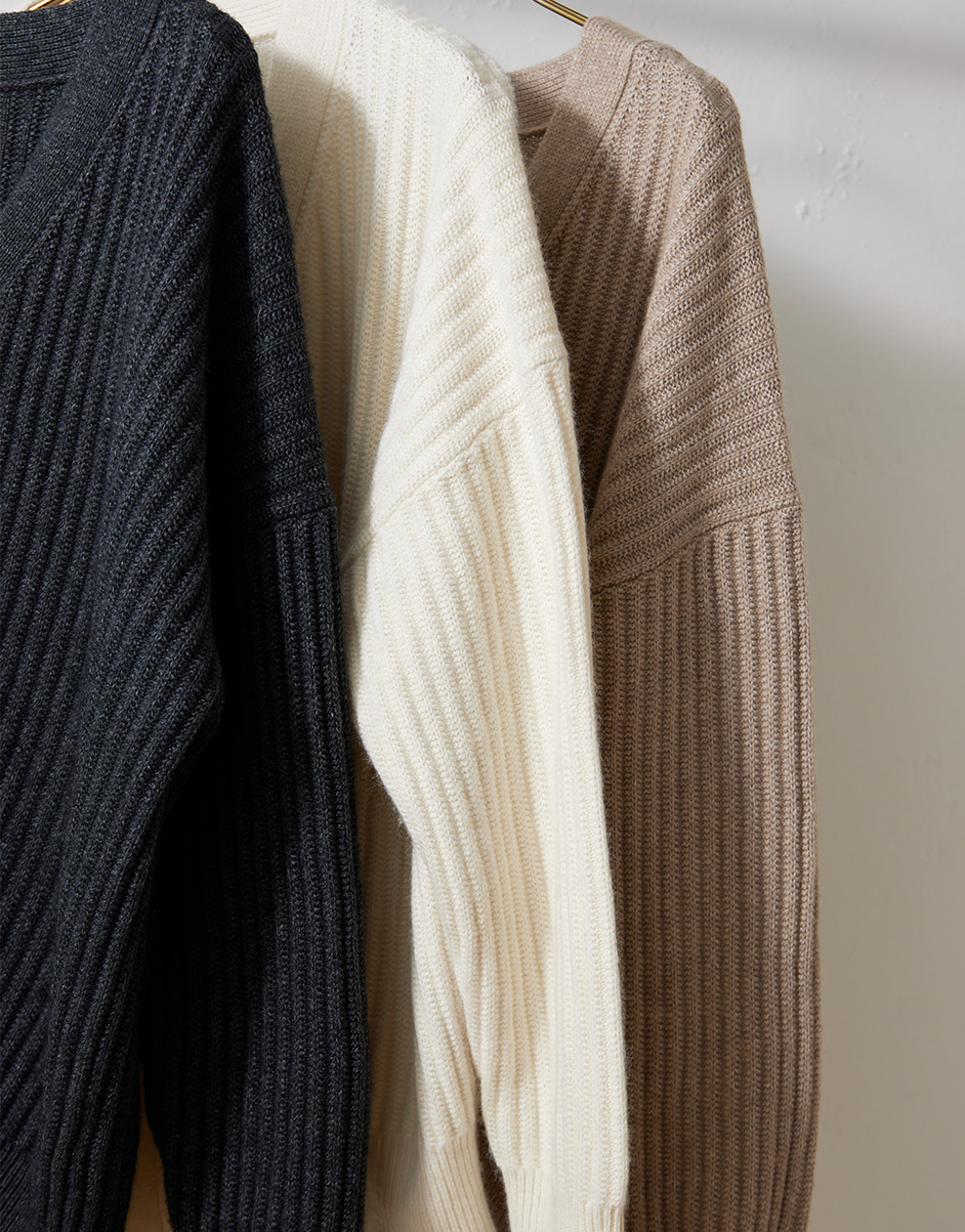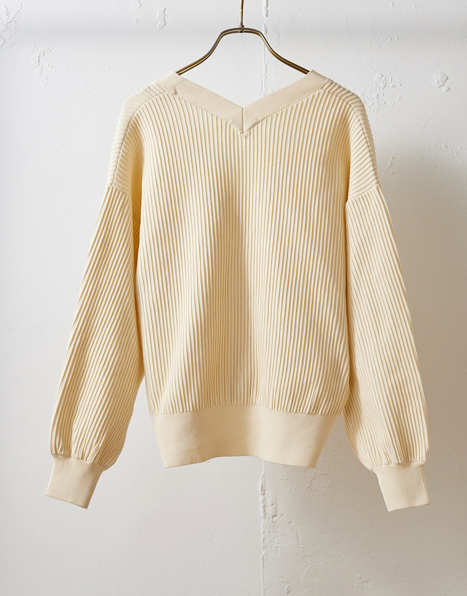 Vネックで顔周りはすっきり、少しゆったりしたオーバーサイズで、レイヤードスタイルなど抜け感のあるオトナの着こなしが楽しめます。