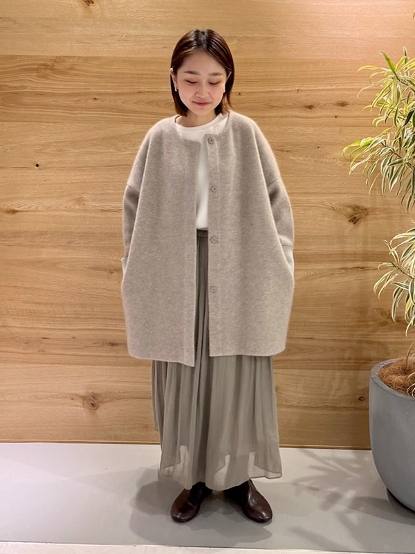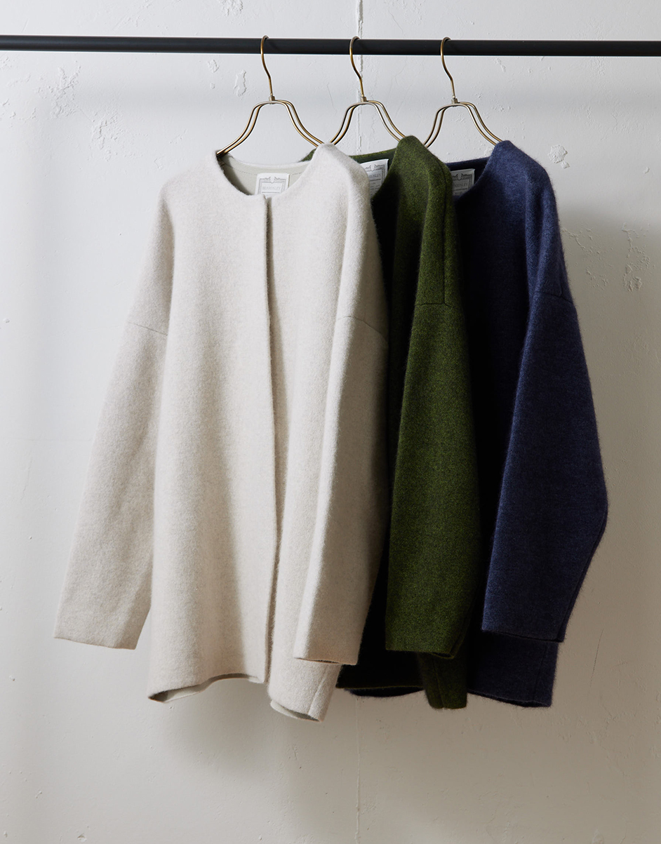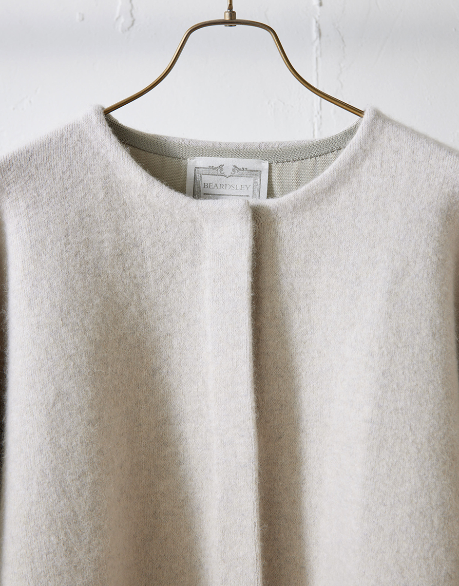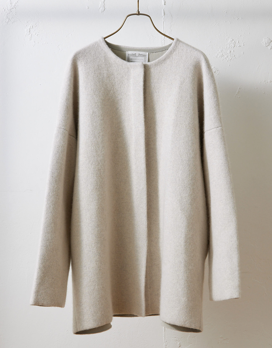 表はふわふわとした程よい起毛感のニット、裏はさらりと肌当たりのよい素材感を使用したコーディガン。品の良さを感じるノーカラーデザインで、ストールなどの巻物やタートルネックともスタイリングしやすいです。全身のバランスを取りやすいハーフコーディガンは小柄な方にもおすすめの1枚。