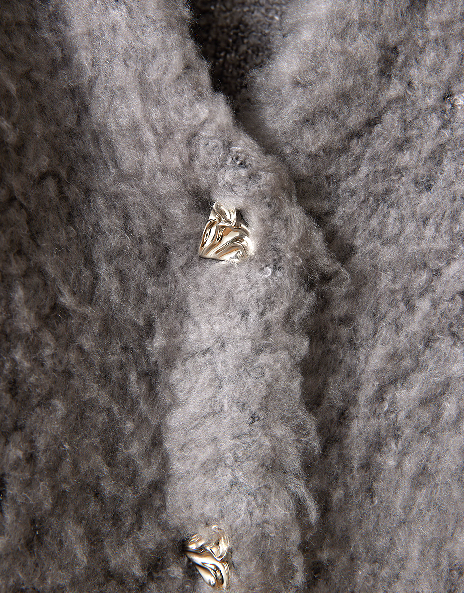 甘くなりすぎない歪なシルバーハートボタンがアクセントに。ネックレス感覚でコーディネートを華やかに仕上げてくれます。