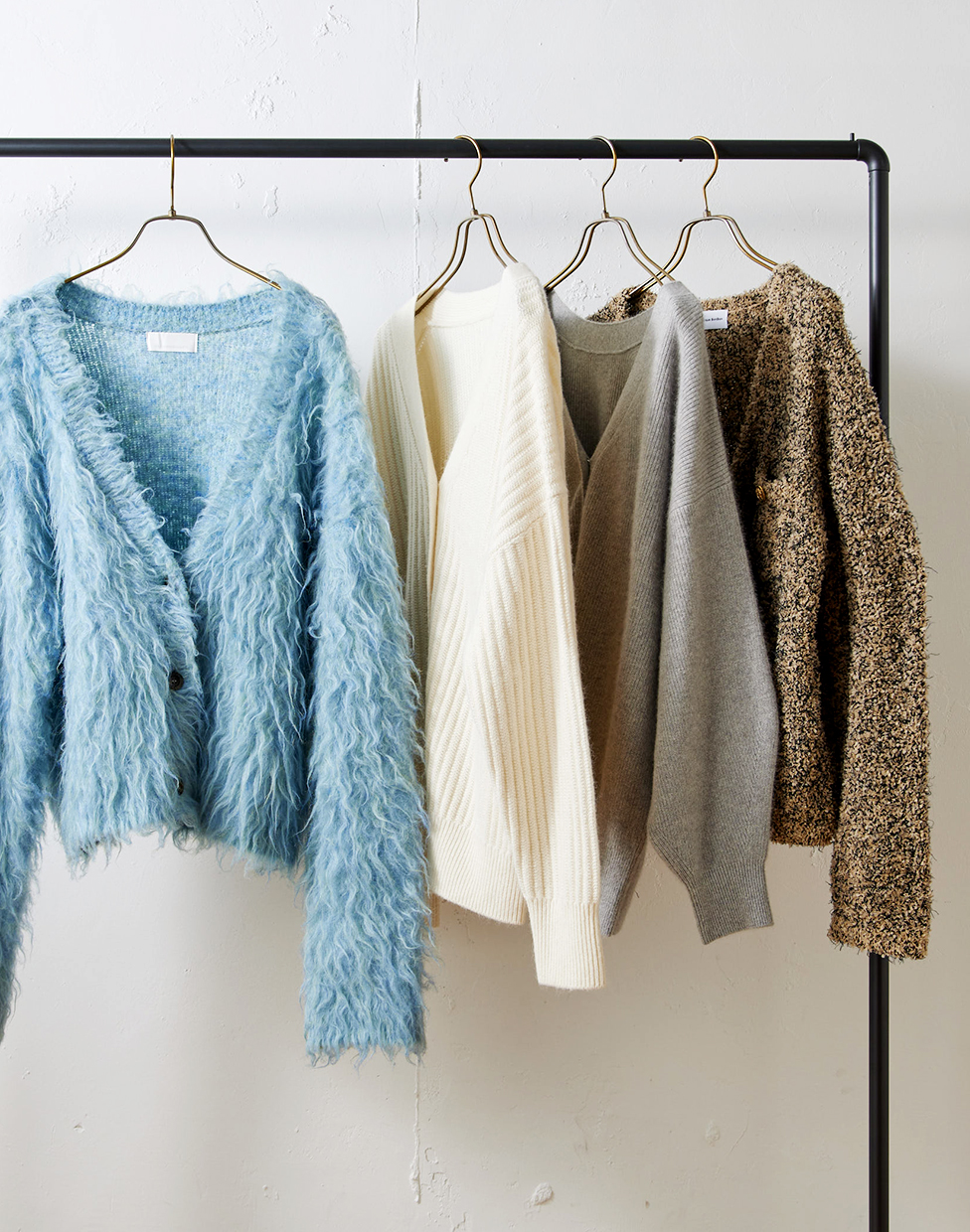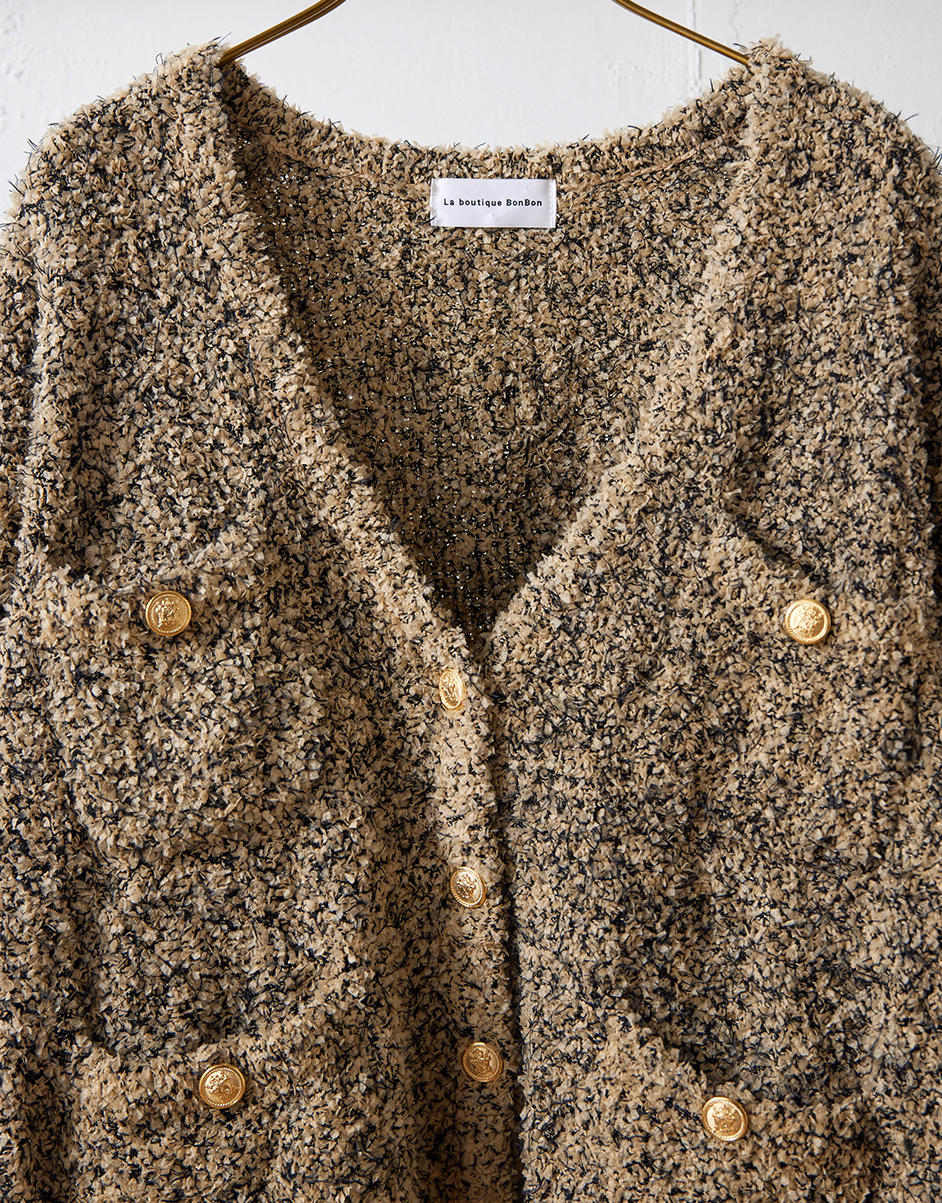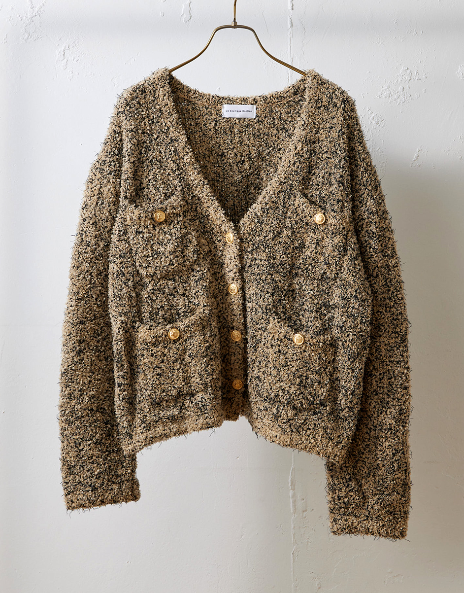 CHECK >さまざまな糸をミックスした編地がニュアンシーな表情をメイク。さらに、4つのポケットとゴールドのボタンも華やかさを引き立てるアクセントに。