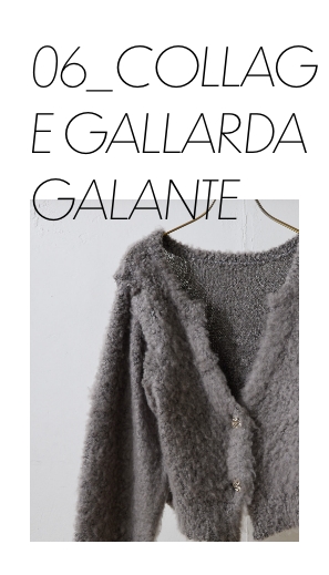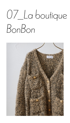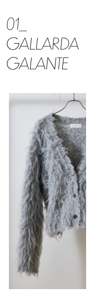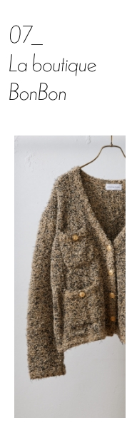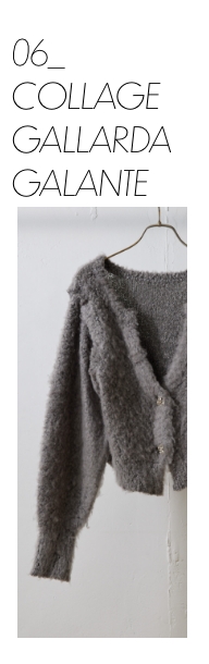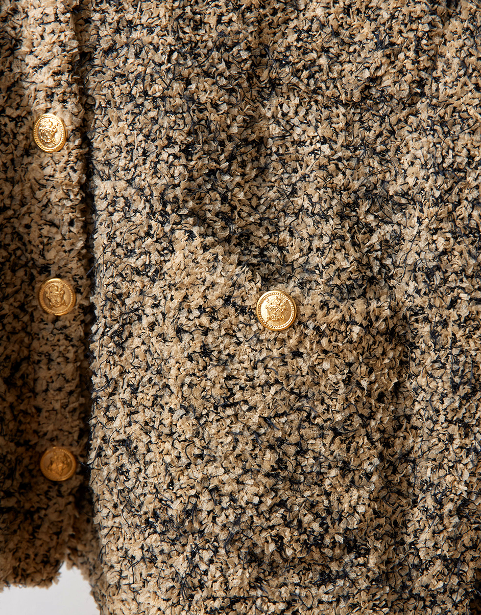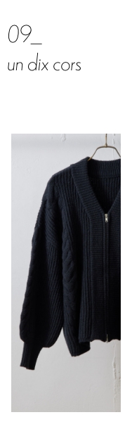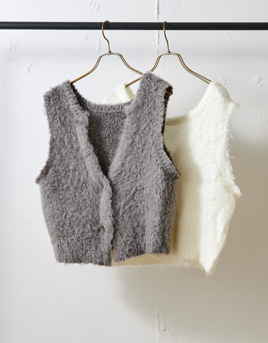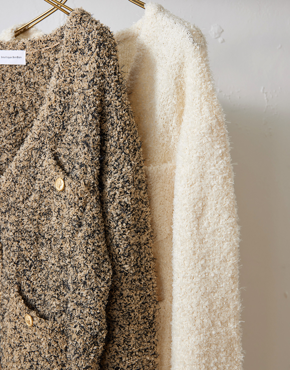 CHECK >さまざまな糸をミックスした編地がニュアンシーな表情をメイク。さらに、4つのポケットとゴールドのボタンも華やかさを引き立てるアクセントに。