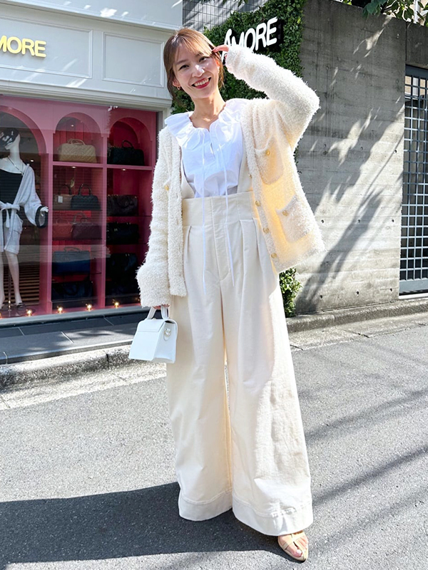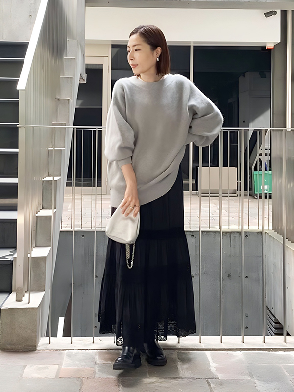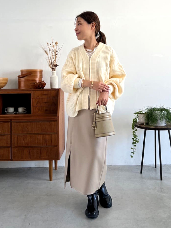 デニムやスラックスパンツとのベーシックな合わせはもちろん、ロング丈のスカートやワンピース合わせのコーデがおすすめです。