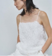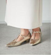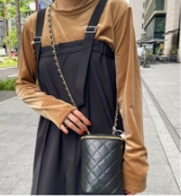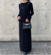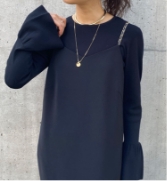 一枚で着映えするチェーンストラップのキャミワンピースを主役にしたオトナスタイル。光沢感のあるニットインナーは上品なベルスリーブがポイント。シャープなネックカフで洗練されたフォーマル感をプラスしました。