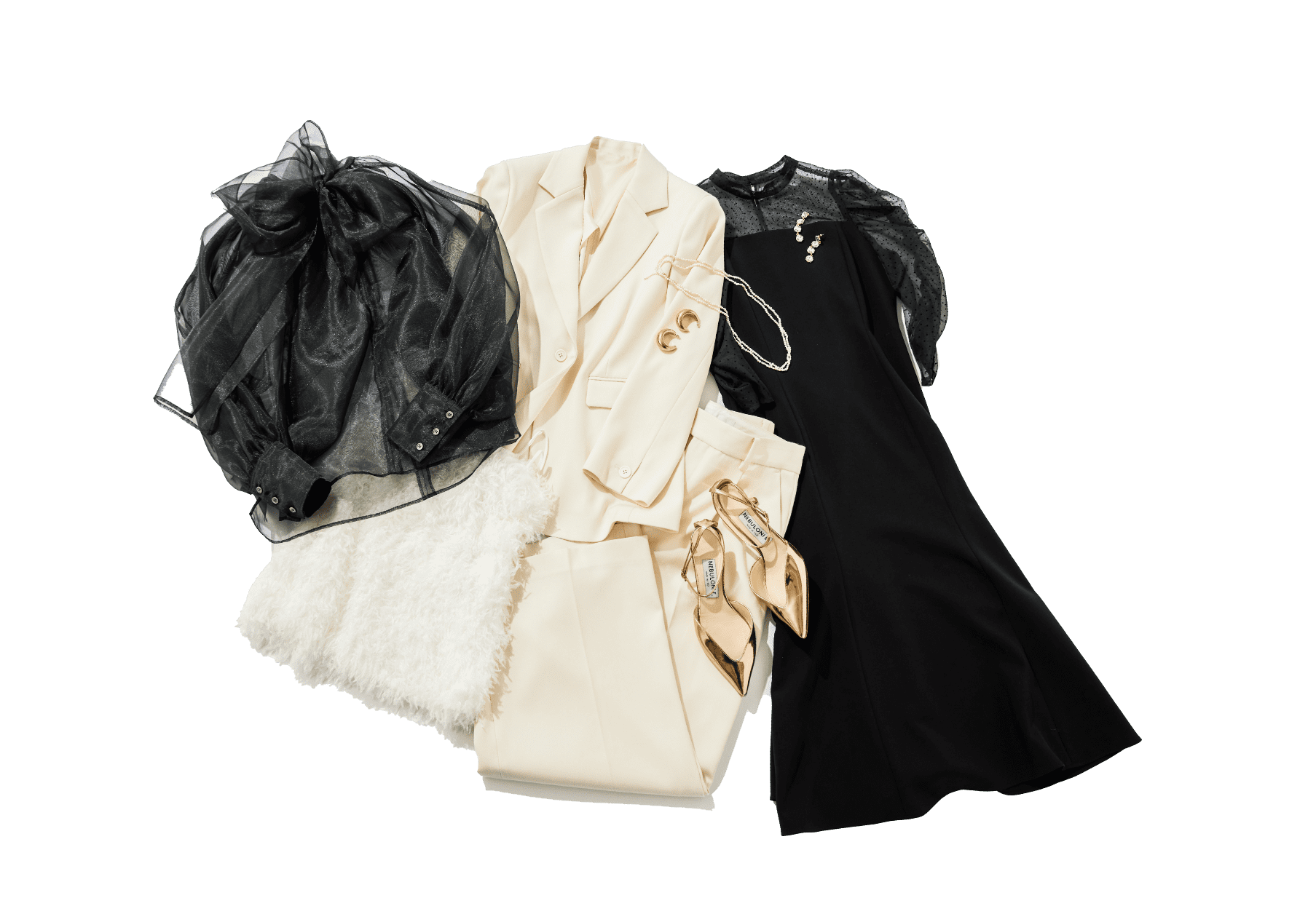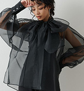オーガンジー素材のボウタイブラウスを使い、オールブラックでも地味に見えない、華やかで存在感のあるコーディネートに。インナーをコルセットにすることで透け感を楽しめる、遊び心のあるオトナのフォーマルスタイルです。