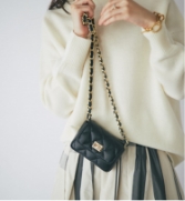 フォーマルまでいかない華やぐシーンにピッタリな、今季トレンドのラメを取り入れたコーディネートがポイント。カーディガンとセットのビスチェをインナーにして適度な肌見せをすることで抜け感が出せます。レザーライクのスカートがオトナの辛さもプラスして、コーディネートの全体感を引き締めます。