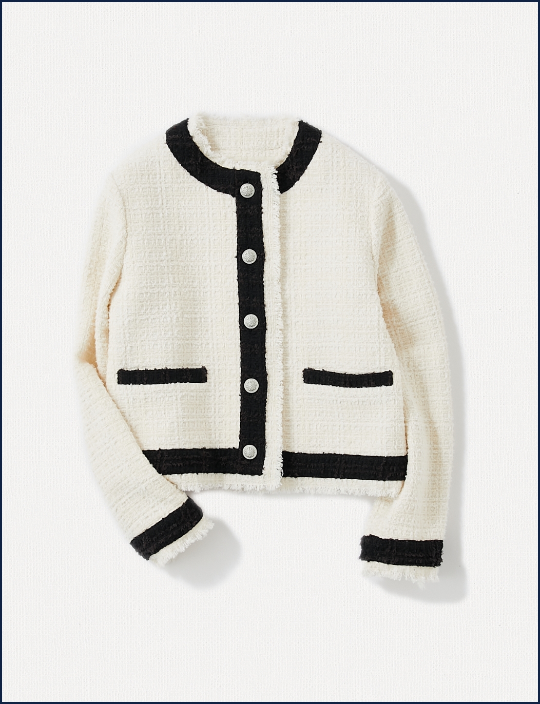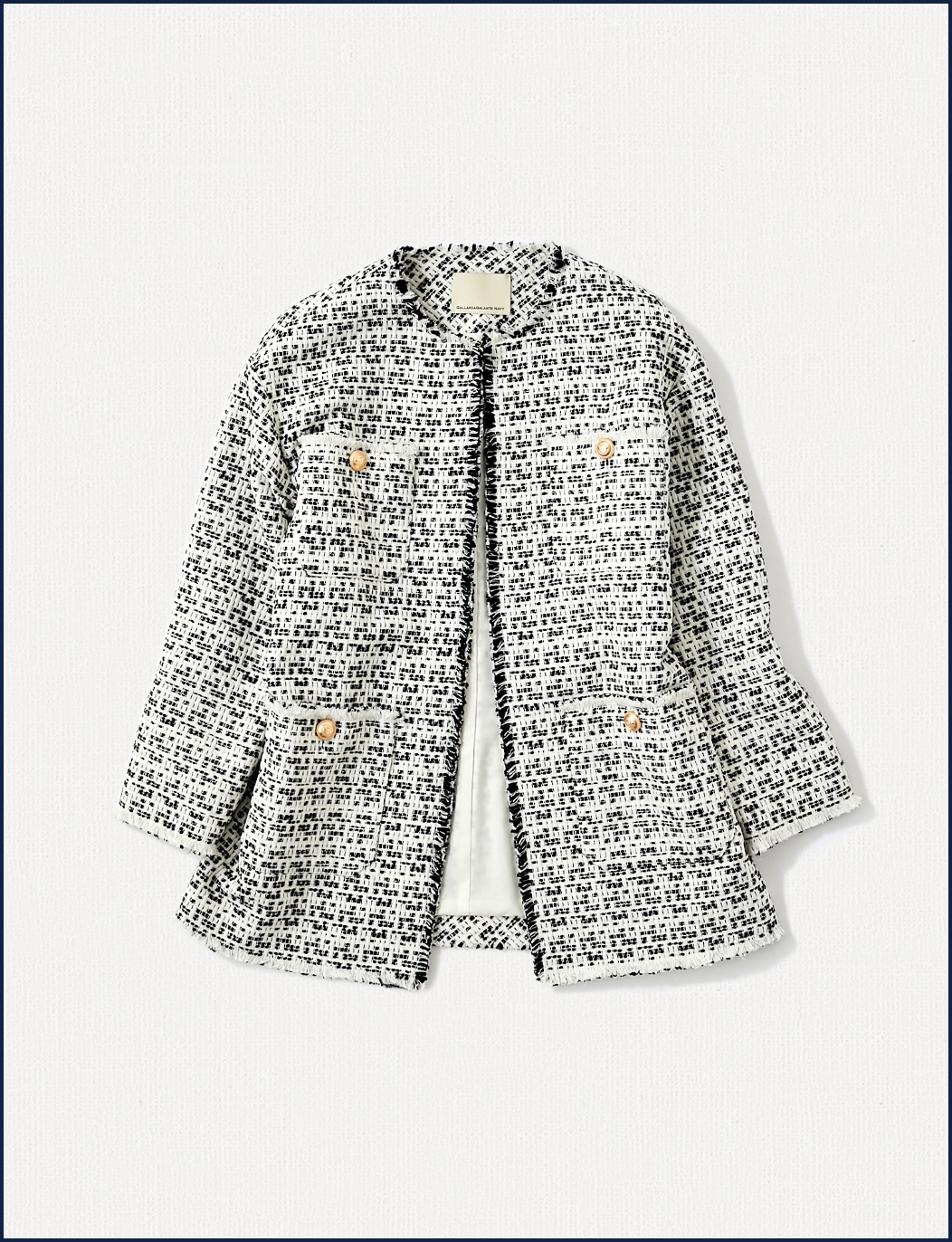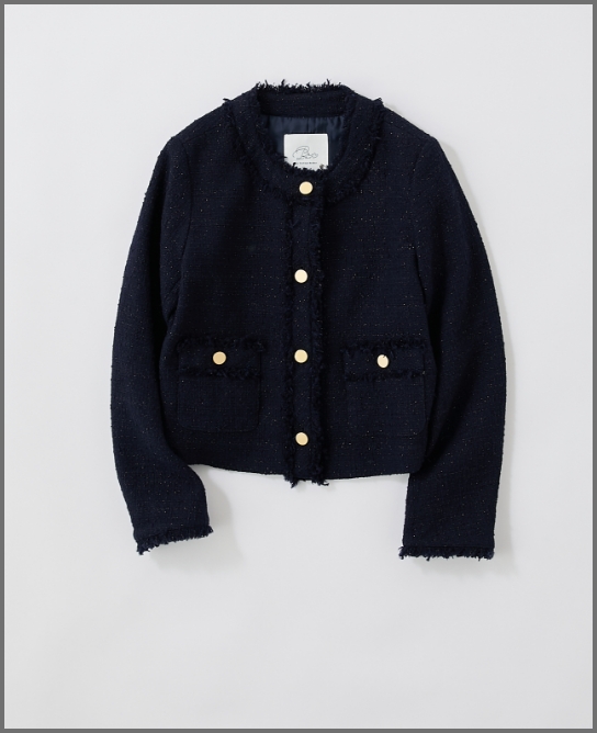 イタリアメーカーのツイードを使用し、配色デザインやメタルボタンなど、エレガントさが最大限に発揮されたクラシカルなジャケット。どんなシーンにも着ていける万能アイテムです。