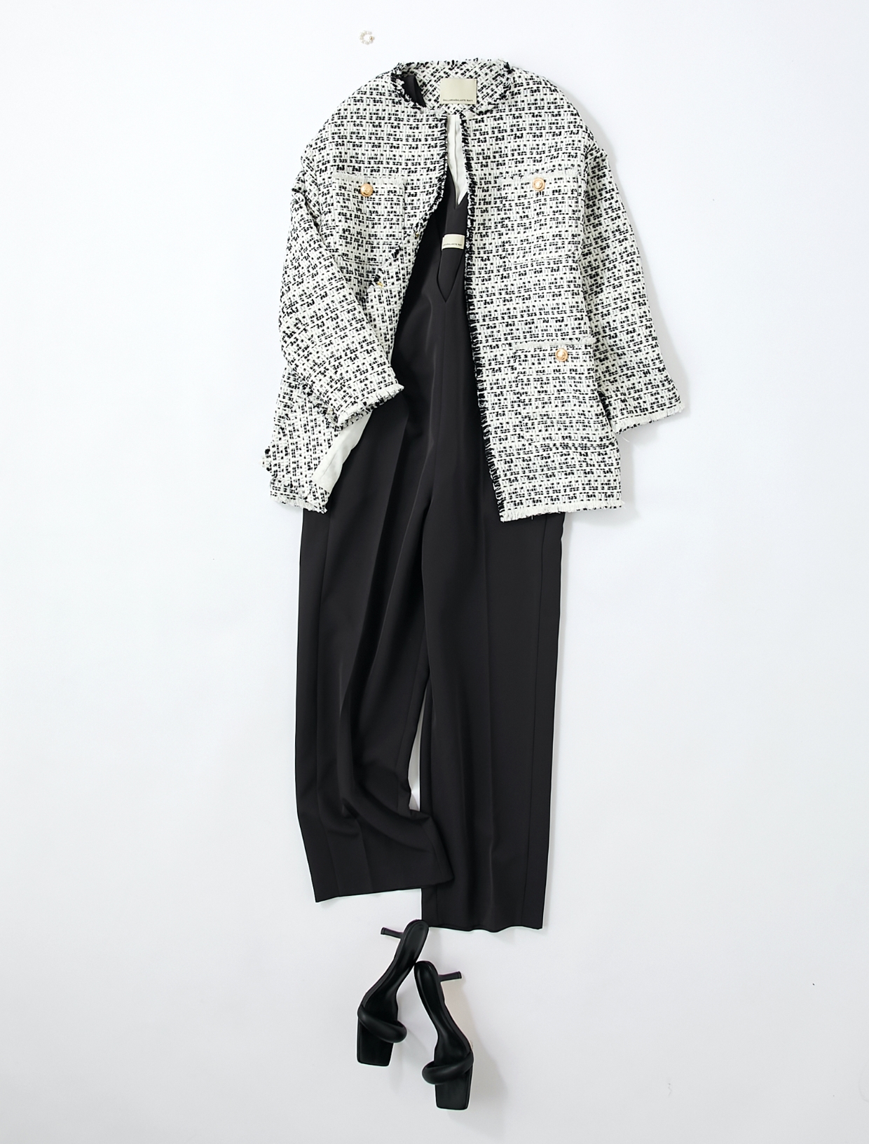 華やかで存在感のあるツイード生地のノーカラージャケットを主役にサロペットをあわせた上品なスタイル。