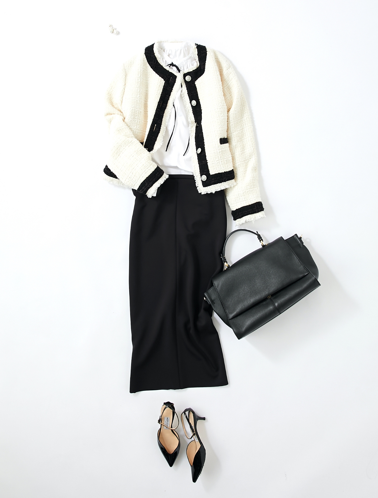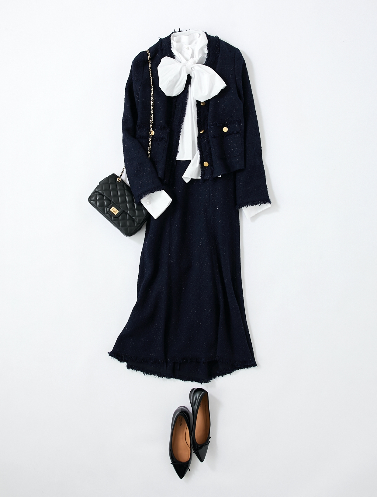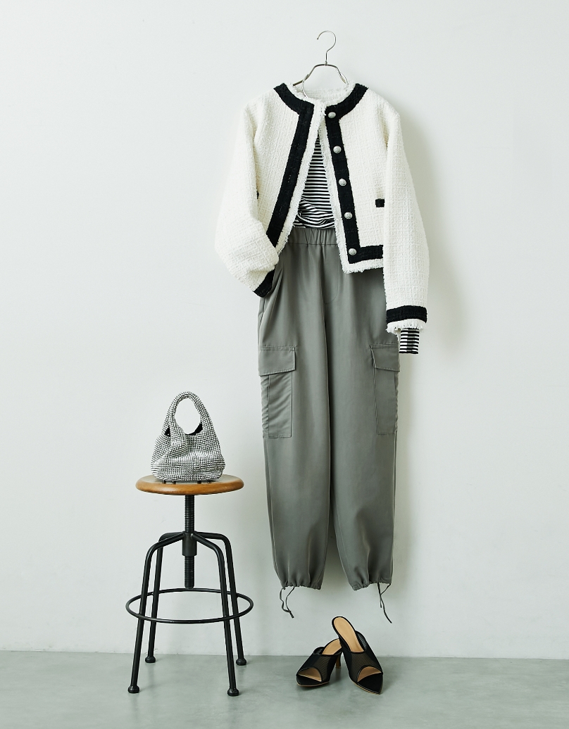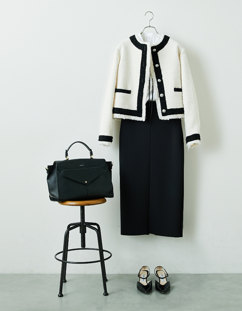 そのままでも華やかなツイード素材にギャザーブラウスを合わせることで、人と差のつくワンランク上のコーディネートが完成。ボトムや小物は黒で引き締め、甘すぎない洗練された印象の着こなしに。