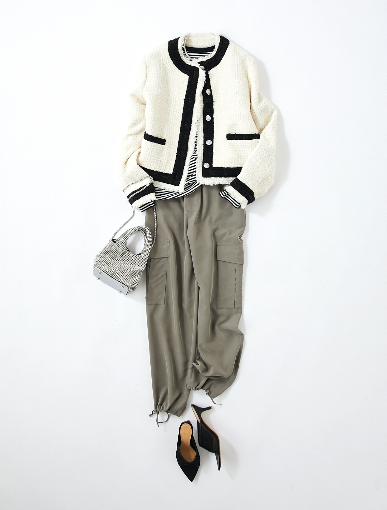 きちんとした印象のあるツイードだからこそ、カジュアルに着るときは思いっきり遊びたい。白Tを合わせがちなインナーを、あえてボーダーにすることでこなれたコーディネートに。シルバーの小物でクールさをプラスして鮮度UP。