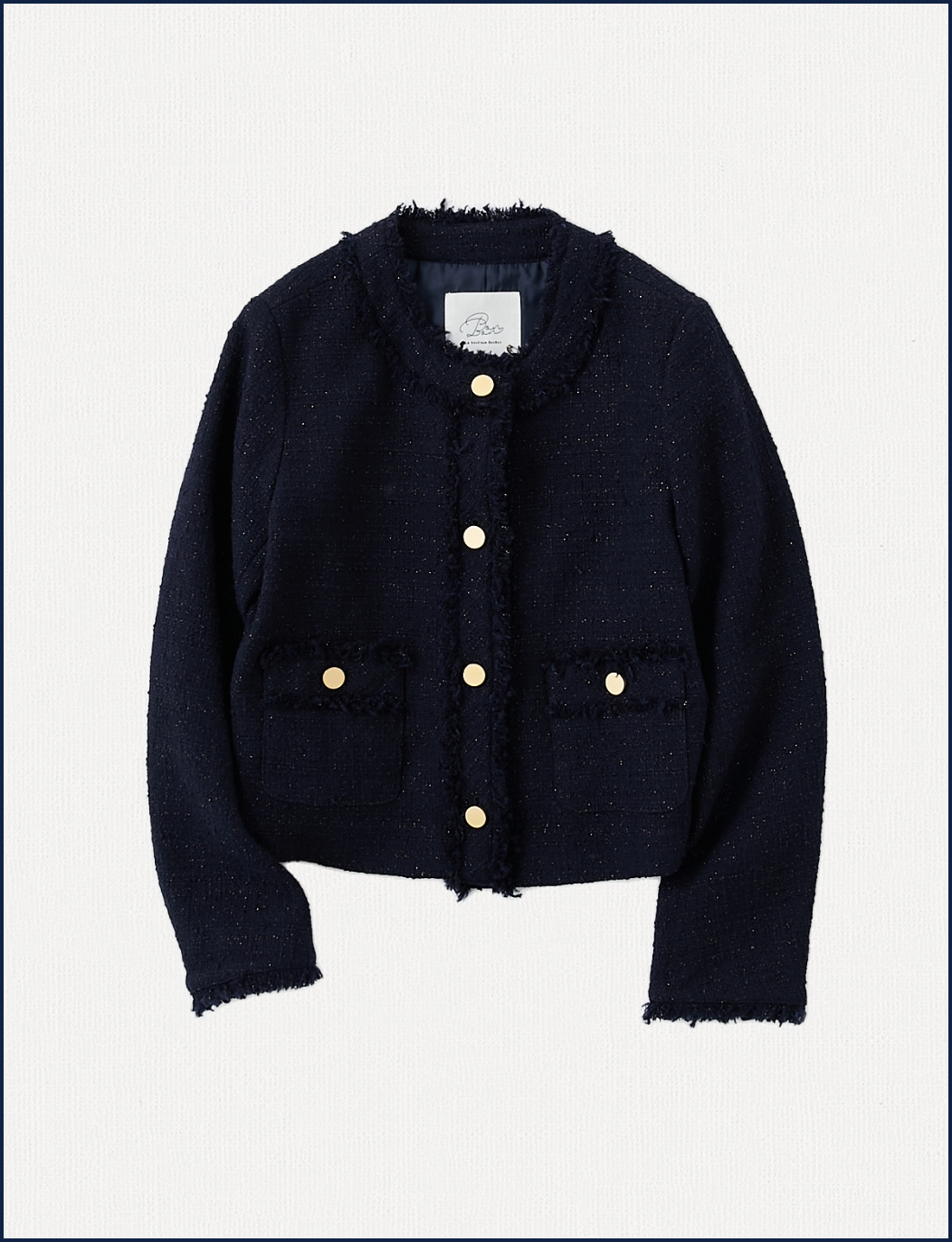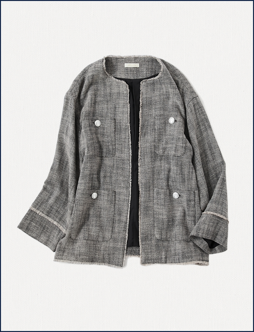 カジュアルな着こなしが叶うややオーバーサイズに仕上げたツイードジャケット。胸元と腰元のポケットに添えられたゴールドのボタンがアクセントに。デニムやスラックスなどマニッシュなアイテムとも相性抜群です。