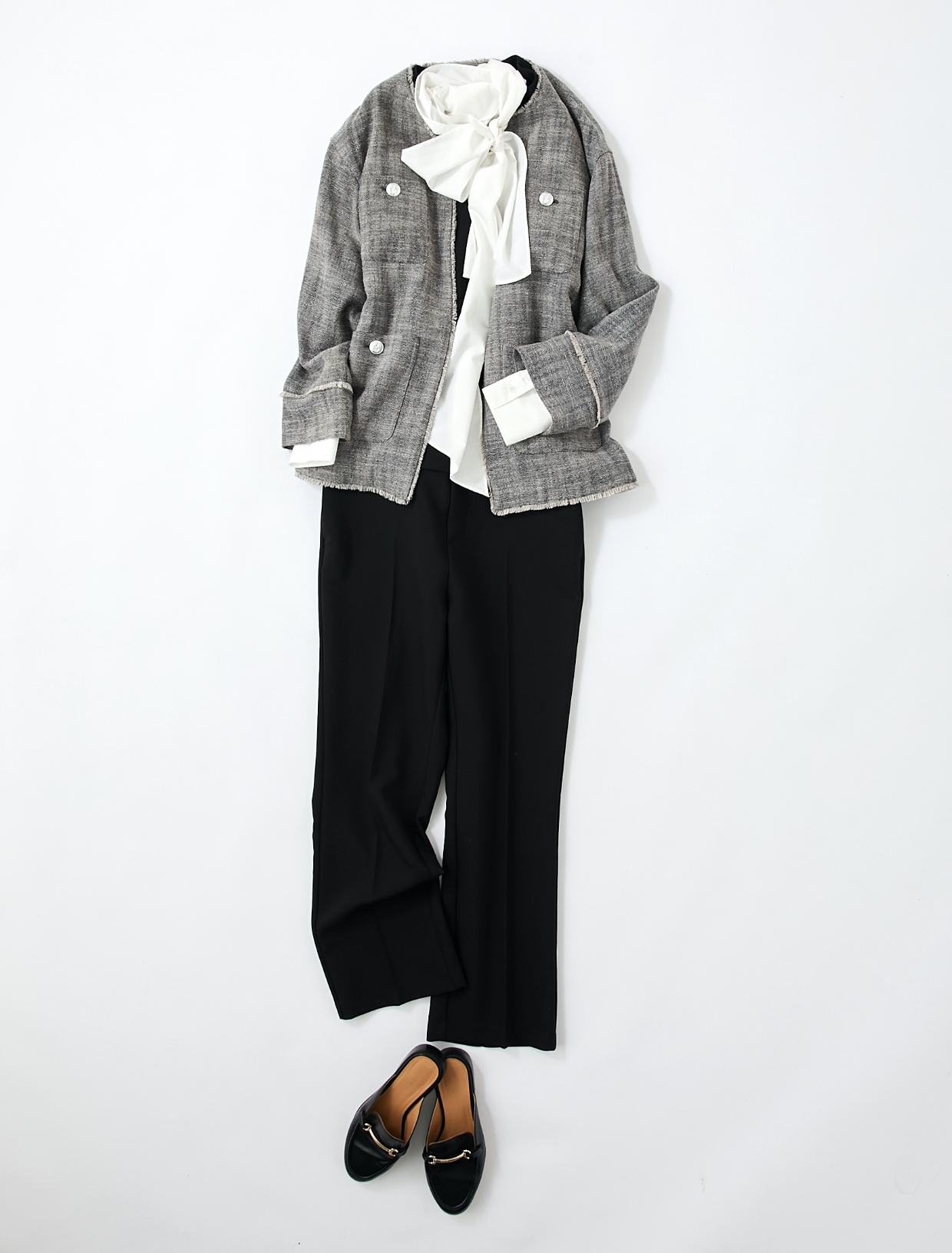 スッキリとしたノーカラーのツイードジャケットにボウタイのブラウスをインすることで華やかさをプラス。ベストとスラックスのセットアップと合わせれば洗練されたスタイリッシュな印象に。