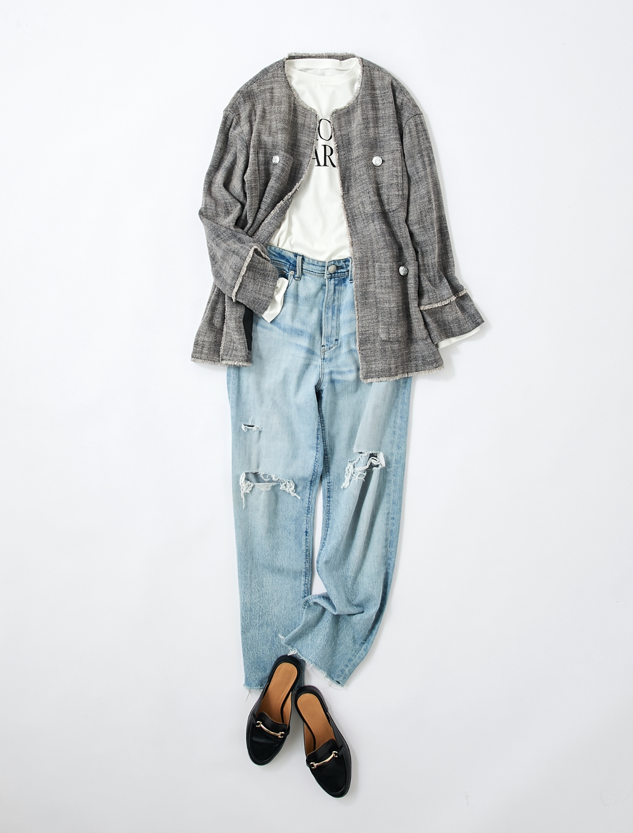 ゆったりとしたサイズ感のツイードジャケットはストレートタイプのデニムパンツと相性抜群です。インナーにシンプルなロゴプリントTを合わせることで、肩の力の抜けた大人カジュアルスタイルを楽しめます。