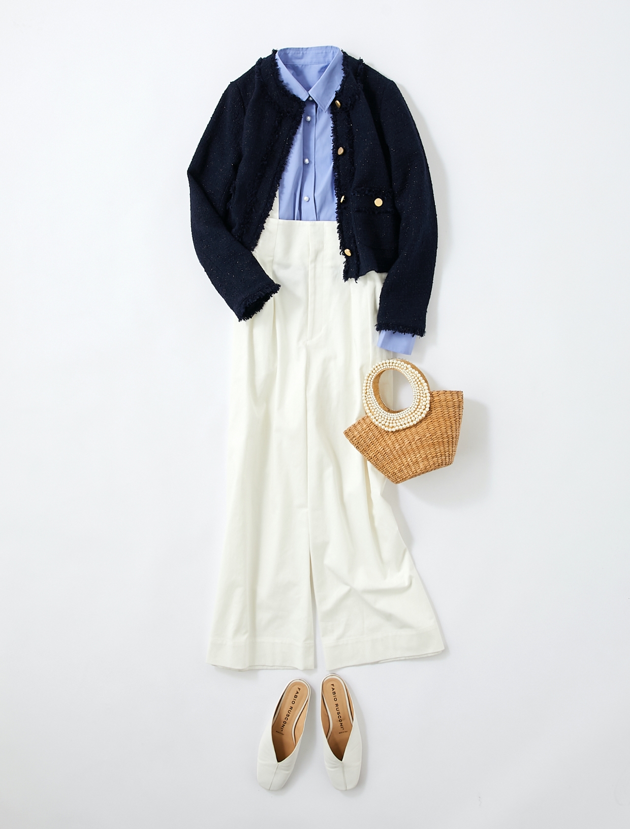 ツイードジャケットをデイリーに着たい時にはパンツスタイルに合わせるのがおすすめです。カジュアルになりがちなパンツスタイルを上品に格上げしてくれます。ネイビー×ホワイトの大人マリンスタイルが完成。