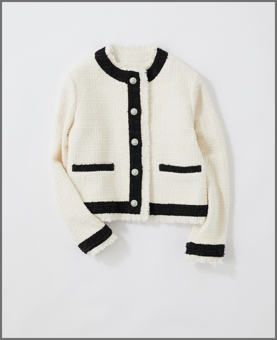 ツイードジャケットのネックラインや裾にあしらったフリンジデザインがエフォートレスな雰囲気をプラスしてくれます。