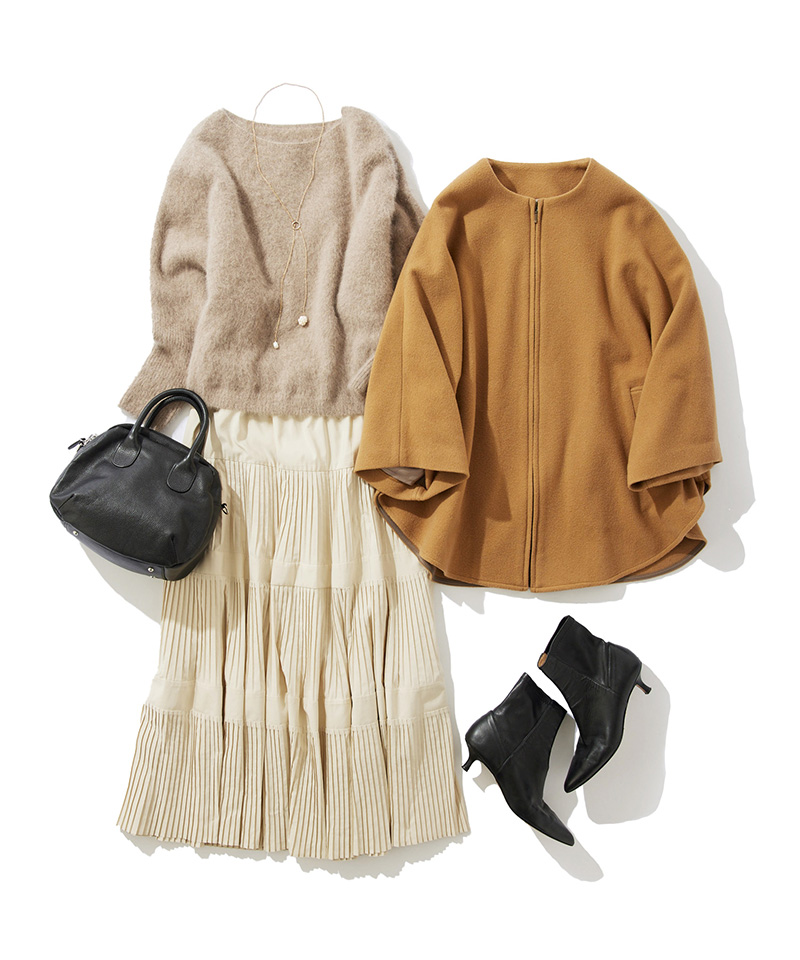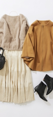 きちんと感も兼ね備えたプリーツスカートと、オンオフ使えるフォックスウールのあったかニットで冬の通勤もおまかせ。脱ぎ着のしやすいポンチョコートは、電車内などでも温度調節がしやすく、ワンピースやパンツスタイルなどにも羽織るだけでサマになる、忙しい朝の強い味方です。