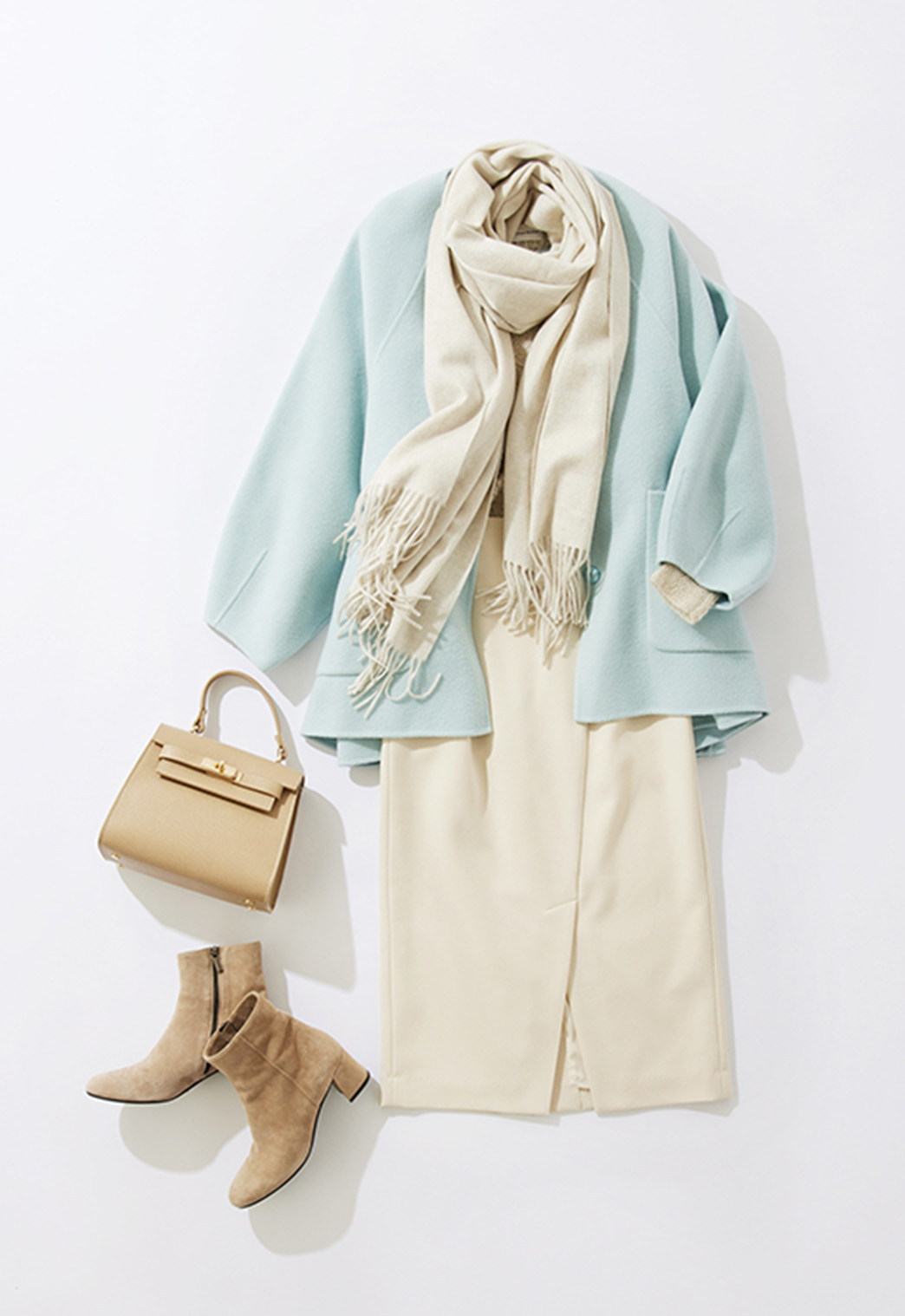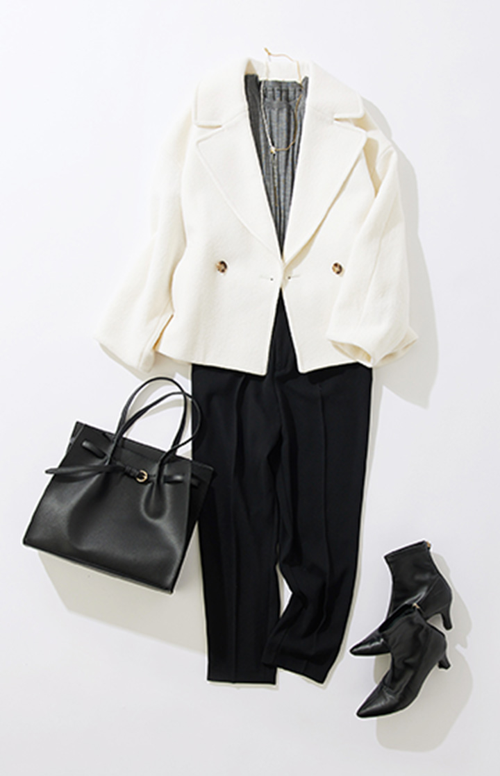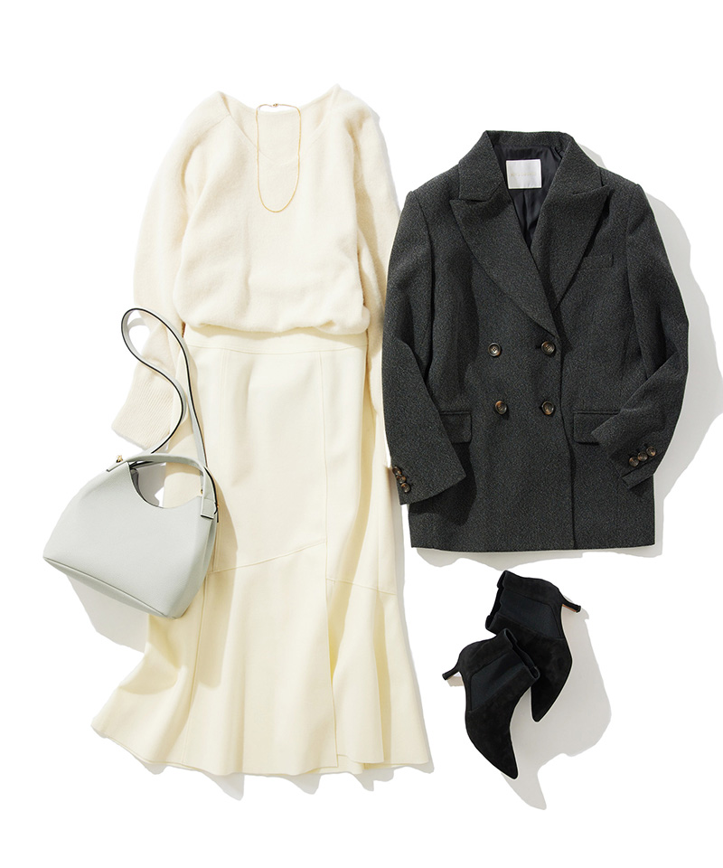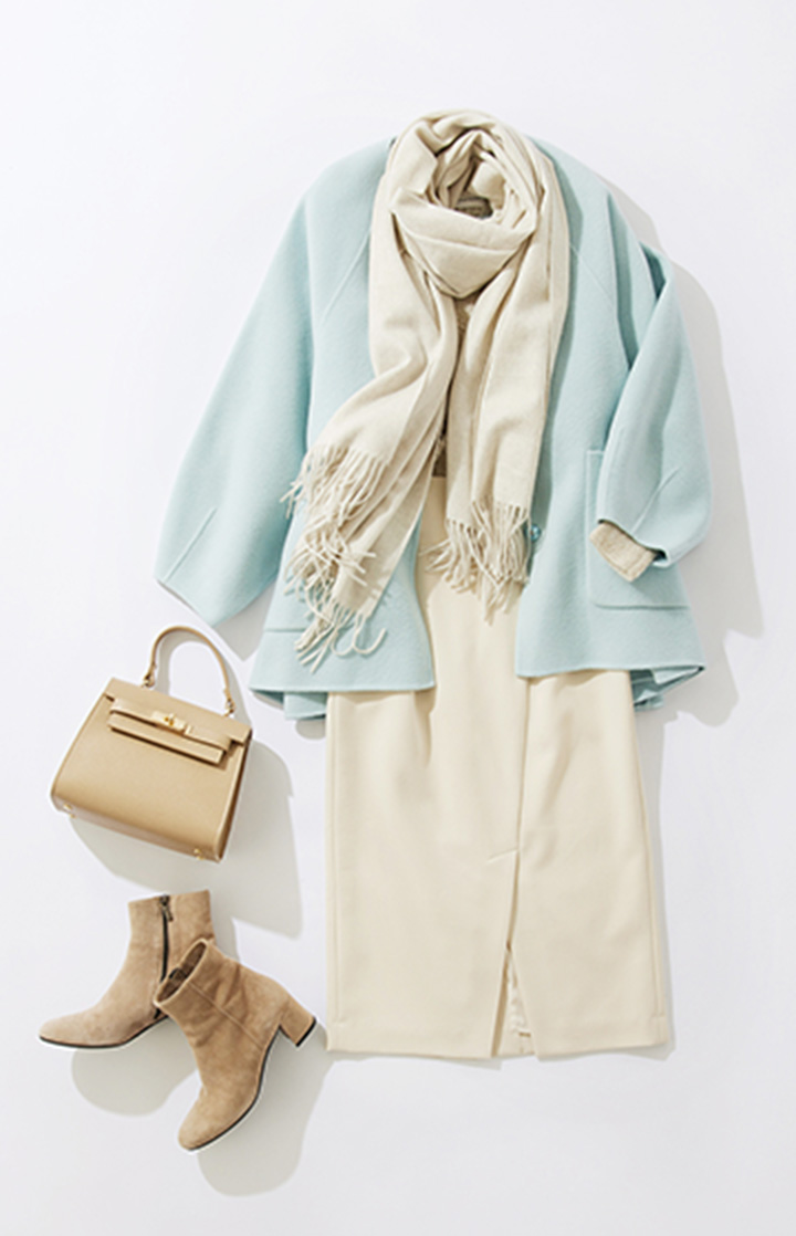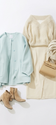 ジャケットライクなハンサムコートを主役にしたオトナの通勤コーデ。ウォーム感のあるへリンボン素材が際立ちます。マーメイドスカートで抜け感を演出し、あえてオフカラーのワントーンで女性らしい要素もプラスしました。